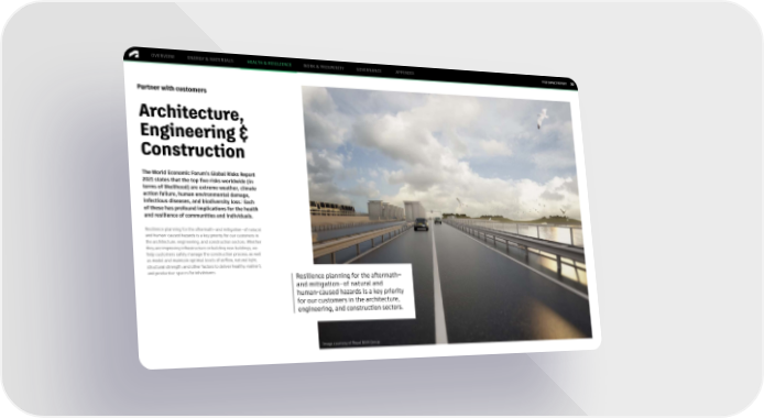 FY22 IMPACT REPORT OVERVIEW ENERGY & MATERIALS HEALTH & RESILIENCE WORK & PROSPERITY GOVERNANCE APPENDIX 30 Partner with customers Architecture, Engineering & Construction The World Economic Forum’s Global Risks Report 2021 states that the top five risks worldwide (in terms of likelihood) are extreme weather, climate action failure, human environmental damage, 1 infectious diseases, and biodiversity loss. Each of these has profound implications for the health and resilience of communities and individuals. Resilience planning for the aftermath—and mitigation—of natural and human-caused hazards is a key priority for our customers in the architecture, engineering, and construction sectors. Whether they are improving infrastructure or building new buildings, we help customers safely manage the construction process, as well as model and maintain optimal levels of airflow, natural light, structural strength, and other factors to deliver healthy, resilient, and productive spaces for inhabitants. Resilience planning for the aftermath— and mitigation—of natural and human-caused hazards is a key priority for our customers in the architecture, engineering, and construction sectors. Image courtesy of Royal BAM Group