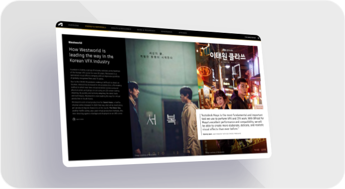 OVERVIEW ENERGY & MATERIALS HEALTH & RESILIENCE WORK & PROSPERITY GOVERNANCE APPENDIX FY22 IMPACT REPORT 22 Westworld How Westworld is leading the way in the Korean VFX industry Founded in 2018 by a group of industry veterans at the forefront of the Korean VFX scene for over 20 years, Westworld is a specialized visual effects company with an impressive portfolio of globally recognized films and TV series. Due to the COVID-19 pandemic making it difficult to shoot on location, interest has increased in virtual production, a filmmaking method in which real-time virtual rendered scenes surround physical actors and props on set using an LED screen during shooting. By quickly and actively adopting the latest tools and techniques, Westworld is now leading the way for virtual production in South Korea. Westworld used virtual production for Sweet Home, a Netflix original series released in 2020 that was shot while monitoring pre-produced digital characters at the studio. The Silent Sea, another Netflix series, also used virtual production methods, this time shooting against a background displayed on an LED screen. “Autodesk Maya is the most fundamental and important Learn more tool we use to perform VFX and CFX work. With Bifrost for Maya’s excellent performance and compatibility, we will be able to create more elaborate, delicate, and realistic visual effects than ever before.” Byeong-geun, Lead Character Technical Director, Westworld Image courtesy of Westworld Image courtesy of Westworld
