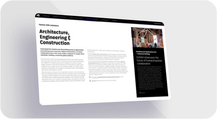 FY22 IMPACT REPORT OVERVIEW ENERGY & MATERIALS HEALTH & RESILIENCE WORK & PROSPERITY GOVERNANCE APPENDIX 57 Partner with customers Architecture, Engineering & Construction Cloud-based AEC solutions are democratizing access to opportunities of potential alternatives—with the data to show how each ranks against a designer’s Autodesk and Smithsonian Arts and fostering more inclusivity. Digital transformation, including original criteria. +Industries Building collaboration tools in the cloud, enables companies to engage talent Through Autodesk Learning and Certification, AEC professionals can gain the knowledge worldwide—building a connected global workforce. and skills to create high-quality, innovative building and infrastructure designs; optimize Exhibit showcases the projects with integrated analysis, visualization, and simulation tools; and improve At the same time, COVID-19 has made digital project delivery more complex, requiring predictability by maximizing constructability and project coordination. future of human/machine ® many design and construction firms to accelerate the pace of digital transformation. In the construction industry, Autodesk’s bid management technology—Autodesk ® New capabilities in Autodesk products and an expansion of its partner ecosystem BuildingConnected Pro and Bid Board Pro—helps owners and builders find reliable collaboration support remote and virtual work environments for AEC practitioners, enabling easier partners for every job using our Builders Network. Project teams can access over collaboration from a single source of truth. With apps available in more than a dozen a million construction professionals, simplify bid workflows, and manage subcontractor As part of the immersive museum exhibition FUTURES, which languages, all stakeholders can navigate securely through models, capture feedback, risk in real time. To increase the diversity of firms bidding for projects, customers can opened in late 2021, we collaborated with the team at the and make decisions together in real time. break down bid packages to smaller scopes of work, making it easier to engage the Smithsonian Arts + Industries Building to create the Co-Lab. AEC professionals can improve the user experience and reduce costs by automating community, attract talent, and build new relationships. And prequalifying subcontractors This exhibit features a novel generatively designed and product development processes with tools such as Generative Design in Revit that take enables project teams to be more inclusive, specifically focusing on Disadvantaged sustainable timber structure, stories showcasing the power advantage of artificial intelligence and machine learning. Traditional processes to develop Business Enterprises (DBEs). of Human/AI collaboration, and an interactive multiplayer and validate design concepts typically limit exploration to only a handful of possible See a summary of Autodesk Architecture, Engineering & Construction solutions that enable generative design experience, “Future Communities.” Guests alternatives due to time constraints. Generative design is disrupting this process by sustainable design. collaborate with both each other and AI, making decisions simultaneously exploring a variety of possible design outcomes and generating a variety Learn how fostering employee diversity can support business growth. and building a community block based on what they deem most important. Each participant takes a different role, choosing to be a “developer,” “ecologist,” or “mayor.” The roles have specific goals and input factors that include social, ecological, and economic considerations, ranging from the availability of green space and housing to the reach of public services and employment opportunities. Learn more
