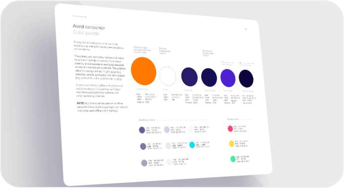 Avast consumer Color palette Orange is the primary color for use in the Avast icon as well as for brand communications and marketing. The primary and secondary background colors have been carefully chosen to boost visual potency and ensure texts are highly readable across all channels and platforms. The palettes allow for strong contrast in light usage (e.g websites, emails, packaging) and dark usages (e.g product UI and in-product-messaging). Colors, such as red, yellow and green must not be employed for anything but ‘status’ indicators within the UI or website, and other marketing materials. NOTE: ALL colors can be used on or offline except the Avast Dark purple logo color which is only to be used offline and in the logo. Avast Guidelines Auxiliary colors Primary background colors Secondary background colors Primary logo, background and accent color Avast Dark Blue RGB: 2 2 / 14 / 83 CMYK: 1 00 / 100 / 7 / 56 WEB: 160E53 Pantone: 275C Avast Purple RGB: 7 8 / 34 / 208 CMYK: 8 8 / 100 / 0 / 0 WEB: 4E 22D 0 Pantone: 267C Avast Orange RGB: 2 55 / 120 / 0 CMYK: 0 / 6 2 / 95 / 0 WEB: FF7800 Pantone: 158C Avast Dark Purple RGB: 4 5 / 54 / 76 CMYK: 9 3 / 86 / 40 / 32 WEB: 2D364C Pantone: 533C Avast Blue RGB: 3 8 / 28 / 106 CMYK: 1 00 / 100 / 0 / 22 WEB: 261C6A Pantone: 2685C White RGB: 2 55 / 255 / 255 CMYK: 0 / 0 / 0 / 0 WEB: ffffff RGB: 1 03 / 96 / 150 WEB: 676096 CMYK: 7 3 / 75 / 0 / 2 RGB: 2 33 / 232 / 243 WEB: E9E8F3 CMYK: 2 3 / 18 / 0 / 0 RGB: 1 7 / 223 / 239 WEB: 11DFEF CMYK: 7 4 / 0 / 10 / 0 RGB: 2 55 / 70 / 114 WEB: FF4672 CMYK: 0 / 87 / 34 / 0 RGB: 1 68 / 164 / 195 WEB: A8A4C3 CMYK: 6 5 / 50 / 8 / 0 RGB: 2 48 / 248 / 252 WEB: F8F8FC CMYK: 4 / 4 / 0 / 4 R GB: 6 7 / 237 / 156 WEB: 43ED9C CMYK: 56 / 0 / 58 / 0 RGB: 1 25 / 119 / 166 WEB: 7D77A6 CMYK: 7 3 / 62 / 0 / 2 RGB: 2 44 / 243 / 250 WEB: F4F3FA CMYK: 1 7 / 10 / 1 / 0 R GB: 2 50 / 219 / 75 WEB: FADB4B CMYK: 3 / 10 / 82 / 0 RGB: 2 12 / 210 / 230 WEB: D4D2E6 CMYK: 3 3 / 23 / 0 / 0 Status colors NB: To only be used offline and in the Avast logo NB: Can also be used as an accent color. 22