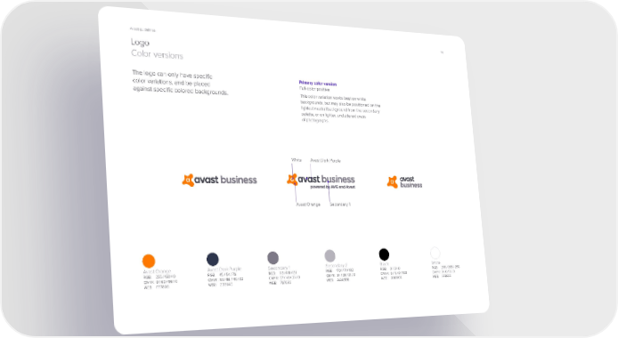 The logo can only have specific color variations, and be placed against specific colored backgrounds. Primary color version Full-color positive This color variation works best on white backgrounds, but may also be positioned on the lightest neutral background from the secondary palette, or on lighter, uncluttered areas of photographs. Avast guidelines Logo Color versions Avast Orange RGB: 2 55 / 120 / 0 CMYK: 0 / 6 2 / 95 / 0 WEB: FF7800 Avast Dark Purple RGB: 4 5 / 54 / 76 CMYK: 9 3 / 86 / 40 / 32 WEB: 2D364C Black RGB: 0 / 0 / 0 C MYK: 0 / 0 / 0 / 1 00 WEB: 000000 Secondary 1 RGB: 1 18 / 118 / 131 CMYK: 5 7 / 49 / 37 / 8 WEB: 767683 Secondary 2 RGB: 1 70 / 171 / 182 CMYK: 3 4 / 28 / 21 / 0 WEB: AAABB6 White RGB: 2 55 / 255 / 255 CMYK: 0 / 0 / 0 / 0 W EB: FFFFFF White Avast Orange Avast Dark Purple Secondary 1 14