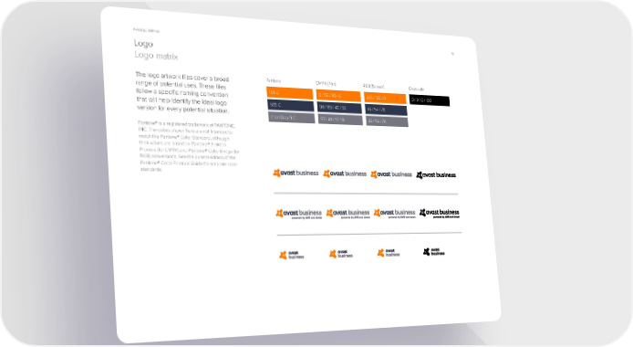 Logo Logo matrix The logo artwork files cover a broad range of potential uses. These files follow a specific naming convention that will help identify the ideal logo version for every potential situation. Pantone® is a registered trademark of PANTONE, INC. The colors shown here are not intended to match the Pantone® Color Standard, although their values are based on Pantone® Solid to Process (for CMYK) and Pantone® Color Bridge (for RGB) conversions. See the current edition of the Pantone® Color Formula Guide for accurate color standards. Avast guidelines Pantone 158 C 533 C Cool Gray 9 C CMYK (Print) 0 / 62 / 95 / 0 96 / 83 / 40 / 32 57 / 49 / 37 / 8 RGB (Screen) 255 / 120 / 0 45 / 54 / 76 45 / 54 / 76 Grayscale 0 / 0 / 0 / 100 19