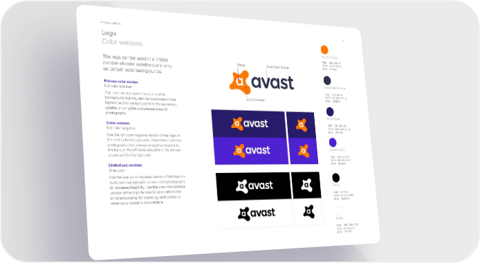 The logo can be used in a limited number of color variations and only on certain color backgrounds. Primary color version Full color positive This color version works best on a white background, but may also be positioned on the lightest neutral background from the secondary palette, or on lighter uncluttered areas of photographs. Color versions Full color negative Use the full color negative version of the logo on the dark color backgrounds shown here and dark photographs that provide enough contrast with the logo, or the official Avast pattern. Do not use on unspecified background. Limited use versions One-color Use the one-color negative version of the logo on dark color backgrounds or over dark photographs for increased legibility. Use the one-color positive version of the logo for special applications like blind-embossing, foil stamping, embroidery or when color output is not available. Avast guidelines Avast Orange RGB: 255 / 120 / 0 CMYK: 0 / 62 / 95 / 0 WEB: FF7800 Logo Color versions Avast Dark Purple RGB: 45 / 54 / 76 CMYK: 93 / 86 / 40 / 32 WEB: 2D364C White Avast Orange Avast Dark Purple Black RGB: 0 / 0 / 0 CMYK: 0 / 0 / 0 / 100 WEB: 000000 Avast Blue RGB: 38 / 28 / 106 CMYK: 100 / 100 / 0 / 22 WEB: 261C6A Avast Purple RGB: 101 / 52 / 172 CMYK: 80 / 89 / 0 / 0 WEB: 6534AC White RGB: 255 / 255 / 255 CMYK: 0 / 0 / 0 / 0 WEB: FFFFFF 5