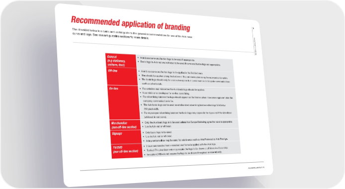 17 Recommended application of branding s k c o l The checklist below is a quick and useful guide to the general recommendations for use of the Avis base b g n i curve and logo. See relevant guideline sections for more details. d l i u b c i s a b e h T General € Avis base curve and button logo to be used if appropriate. (e.g stationery, € Basic logo in Avis red and whiteout to be used if curve and button logo not appropriate. uniform, fl eet) Off-line € Avis base curve and button logo to be applied in the first instance. € This should be applied along the bottom of the communication using the appropriate template. € The basic logo should only be used when space is at a minimum or on bespoke communications such as advertorials. On-line € For websites and microsites the Avis basic logo should be applied. € New mini curve developed for on-line advertising. € For advertising banners the logo should appear on the frames when it becomes apparent what the company communication is for. € The Avis basic logo can be used on smaller sized advertising banners when logo falls below 200 pixel width. € For skyscraper advertising banners the basic logo may appear in the top curve if the size allows (whiteout in red curve). Merchandise € Only the Avis basic logo is to be used unless Avis Europe Marketing agree the curve is appropriate. (see off-line section) € Use in Avis red or whiteout. Signage € Only basic logo to be used. € Use in Avis red or whiteout. € Avis premium silver may be used for sub-brands such as Avis Preferred or Avis Prestige. TV/DVD € It is recommended that a standard end frame is applied with the Avis logo. (see off-line section) € Tactical TV advertisements may require the logo to be shown at all times in a base strip. € In-station DVDs do not require the logo to be shown throughout or intermittently. Avis Brand Guidelines 07.08