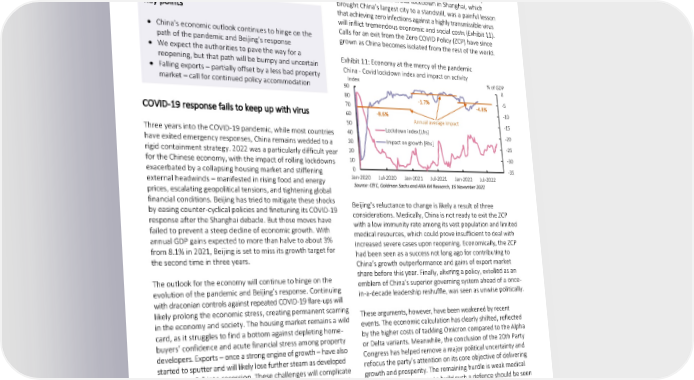 China – A bumpy path to reopening Aidan Yao mutate turning the pandemic to endemic, which may already Senior Economist (China) be the case outside China. Second, and related, the medical Macro Research – Core Investments response has to adapt for a long fight against a constantly changing enemy. The brutal lockdown in Shanghai, which brought China’s largest city to a standstill, was a painful lesson Key points that achieving zero infections against a highly transmissible virus will inflict tremendous economic and social costs (Exhibit 11). • China’s economic outlook continues to hinge on the Calls for an exit from the Zero COVID Policy (ZCP) have since path of the pandemic and Beijing’s response grown as China becomes isolated from the rest of the world. • We expect the authorities to pave the way for a reopening, but that path will be bumpy and uncertain Exhibit 11: Economy at the mercy of the pandemic • Falling exports – partially offset by a less bad property China - Covid lockdown index and impact on activity market – call for continued policy accommodation Index % of GDP 90 0 80 -1.7% -5 70 -4.8% COVID-19 response fails to keep up with virus 60 -8.6% -10 50 Annual average impact -15 Three years into the COVID-19 pandemic, while most countries 40 Lockdown index [Lhs] -20 have exited emergency responses, China remains wedded to a 30 Impact on growth [Rhs] -25 rigid containment strategy. 2022 was a particularly difficult year 20 for the Chinese economy, with the impact of rolling lockdowns 10 -30 exacerbated by a collapsing housing market and stiffening 0 -35 external headwinds – manifested in rising food and energy Jan-2020 Jul-2020 Jan-2021 Jul-2021 Jan-2022 Jul-2022 prices, escalating geopolitical tensions, and tightening global Source: CEIC, Goldman Sachs and AXA IM Research, 16 November 2022 financial conditions. Beijing has tried to mitigate these shocks by easing counter-cyclical policies and finetuning its COVID-19 Beijing’s reluctance to change is likely a result of three response after the Shanghai debacle. But those moves have considerations. Medically, China is not ready to exit the ZCP failed to prevent a steep decline of economic growth. With with a low immunity rate among its vast population and limited annual GDP gains expected to more than halve to about 3% medical resources, which could prove insufficient to deal with from 8.1% in 2021, Beijing is set to miss its growth target for increased severe cases upon reopening. Economically, the ZCP the second time in three years. had been seen as a success not long ago for contributing to China’s growth outperformance and gains of export market The outlook for the economy will continue to hinge on the share before this year. Finally, altering a policy, extolled as an emblem of China’s superior governing system ahead of a once- evolution of the pandemic and Beijing’s response. Continuing in-a-decade leadership reshuffle, was seen as unwise politically. with draconian controls against repeated COVID-19 flare-ups will likely prolong the economic stress, creating permanent scarring These arguments, however, have been weakened by recent in the economy and society. The housing market remains a wild events. The economic calculation has clearly shifted, reflected card, as it struggles to find a bottom against depleting home- by the higher costs of tackling Omicron compared to the Alpha buyers’ confidence and acute financial stress among property or Delta variants. Meanwhile, the conclusion of the 20th Party developers. Exports – once a strong engine of growth – have also Congress has helped remove a major political uncertainty and started to sputter and will likely lose further steam as developed economies fall into recession. These challenges will complicate refocus the party’s attention on its core objective of delivering Beijing’s counter-cyclical policies and make next year’s outlook growth and prosperity. The remaining hurdle is weak medical more uncertain than usual. Below, we explain in detail these defences. Hence, moves to build such a defence should be seen four drivers of the economy and the risks to our assessment. as preparation for an exit from the ZCP. Changing tack to reprioritise the economy Our baseline view for 2023 rests crucially on the assumption that the ZCP will be adjusted for an eventual reopening of the economy. We see this proceeding in three phases. Phase one Starting with the pandemic, developments over the past year focuses on getting the public medically and mentally ready for a have likely brought two revelations to Beijing. First, the virus is change. This involves raising the vaccination rate (particularly unlikely to disappear any time soon, and could continue to for the elderly), introducing antiviral drugs, constructing more 16