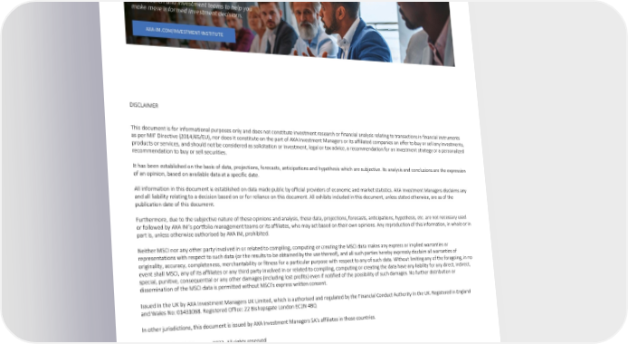 Our Research is available online: www.axa-im.com/investment-institute DISCLAIMER This document is for informational purposes only and does not constitute investment research or financial analysis relating to transactions in financial instruments as per MIF Directive (2014/65/EU), nor does it constitute on the part of AXA Investment Managers or its affiliated companies an offer to buy or sell any investments, products or services, and should not be considered as solicitation or investment, legal or tax advice, a recommendation for an investment strategy or a personalized recommendation to buy or sell securities. It has been established on the basis of data, projections, forecasts, anticipations and hypothesis which are subjective. Its analysis and conclusions are the expression of an opinion, based on available data at a specific date. All information in this document is established on data made public by official providers of economic and market statistics. AXA Investment Managers disclaims any and all liability relating to a decision based on or for reliance on this document. All exhibits included in this document, unless stated otherwise, are as of the publication date of this document. Furthermore, due to the subjective nature of these opinions and analysis, these data, projections, forecasts, anticipations, hypothesis, etc. are not necessary used or followed by AXA IM’s portfolio management teams or its affiliates, who may act based on their own opinions. Any reproduction of this information, in whole or in part is, unless otherwise authorised by AXA IM, prohibited. Neither MSCI nor any other party involved in or related to compiling, computing or creating the MSCI data makes any express or implied warranties or representations with respect to such data (or the results to be obtained by the use thereof), and all such parties hereby expressly disclaim all warranties of originality, accuracy, completeness, merchantability or fitness for a particular purpose with respect to any of such data. Without limiting any of the foregoing, in no event shall MSCI, any of its affiliates or any third party involved in or related to compiling, computing or creating the data have any liability for any direct, indirect, special, punitive, consequential or any other damages (including lost profits) even if notified of the possibility of such damages. No further distribution or dissemination of the MSCI data is permitted without MSCI’s express written consent. Issued in the UK by AXA Investment Managers UK Limited, which is authorised and regulated by the Financial Conduct Authority in the UK. Registered in England and Wales No: 01431068. Registered Office: 22 Bishopsgate London EC2N 4BQ In other jurisdictions, this document is issued by AXA Investment Managers SA’s affiliates in those countries. © AXA Investment Managers 2022. All rights reserved AXA Investment Managers SA Tour Majunga – La Défense 9 – 6 place de la Pyramide 92800 Puteaux – France Registered with the Nanterre Trade and Companies Register under number 393 051 826 www.axa-im.com