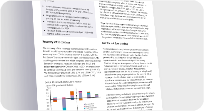 Japan – Recovery appears set to continue Modupe Adegbembo excludes only fresh food) is on the rise and likely to peak this Junior Economist (G7) quarter. Government intervention is set to cap the increase in Macro Research – Core Investments inflation in 2023 through additional subsidies on energy. Following this, we expect to see inflation fall in 2024, though companies becoming more willing to pass on price increases to Key points their customers provides some upside risks. We expect CPI inflation to average 2.4% in 2022, 2.1% in 2023 and 1.3% in • Japan’s economy looks set to remain robust – we 2024 (consensus 2.3%, 1.6% and 1.0%). That said, the outlook is forecast GDP growth of 1.6%, 1.7% and 1.3% in 2022, for inflation to fall back below the BoJ’s target, with having just 2023 and 2024 respectively risen above target due to extreme external pressure, and far • Wage pressures are rising and evidence of firms short of elevated inflation across the globe. passing on cost increases are growing • We expect the BoJ to remain on hold in 2023, but Wage dynamics in Japan appear to be improving but do not yet positive shifts in pricing norms could see yield curve suggest a significant shift in Japan’s pricing norms and spring wage control adjusted in 2024 negotiations will be key. Rengo, Japan’s largest Trade Union • The next BoJ Governor expected in April 2023 could confederation, confirmed it will request a total pay increase of 5% signal a shift in approach. but final results tend to come in below Rengo’s target – in 2022 Rengo aimed for total pay increase of 4% and achieved 2.2%. Recovery set to continue BoJ: The last dove standing The recovery of the Japanese economy looks set to continue. The BoJ continues to emphasise wage growth as a necessary Growth should be supported by the delayed reopening of the condition to changing its ultra-accommodative policy stance. economy from COVID-19 and a recovery in tourism, with the This has remained the philosophy under Haruhiko Kuroda’s borders of the country now fully open to overseas visitors. The governorship, but things may change following the positive growth momentum will be tempered by slowing external appointment of a new Governor in April 2023. Deputy demand – we expect recession in Europe and the US and Governor Masayoshi Amamiya and ex-Deputy Governor Hiroshi below-trend growth in China in 2023. In 2024 we expect Japan Nakaso are seen as frontrunners. Nakaso is widely seen as to continue catching up to its pre-pandemic trend (Exhibit 10). more in favour of reducing monetary stimulus and his We forecast GDP growth of 1.6%, 1.7% and 1.3% in 2022, 2023 appointment would raise the risk of a change in policy from Q3 and 2024 respectively (consensus 1.5%, 1.3% and 1.1%). 2023 after the spring wage negotiations. We currently still do not expect the 2% inflation target to be achieved in a Exhibit 10: Growth continues to recover sustainable manner during our forecast horizon, but we expect Japan: GDP growth contributions the post-Kuroda BoJ to adjust the ultra-accommodative yield %yoy curve control (YCC) policy after taking into account recent 3.0 inflation, shifts in expectations and a gradual rise in wages. 2.0 1.0 In terms of timing, we believe a decision to change BoJ policy is 0.0 unlikely before the spring 2023 wage negotiations. But weaker -1.0 global economic conditions could see the BoJ proceed -2.0 Consumption cautiously and only tweak policy early in the following year -3.0 Government -4.0 Fixed investment when external conditions improve. In addition, we expect the Inventories BoJ to wait for clearer evidence that underlying inflationary -5.0 Net Trade pressures are growing and to see if core inflation remains -6.0 above previous levels once the energy shock dissipates. We 2019 2020 2021 2022 2023 2024 Source: Refinitiv and AXA IM Research, 25 November 2022 expect the BoJ to shift the YCC target of around 0% plus or minus 25 basis points (bps) on 10-year Japanese government Inflation spike to fade, but price pressures growing bond yields to +/-40bps and to make this move in early 2024. Yet this is a finely balanced call and we see risks skewed to the Inflation is set to remain above the Bank of Japan’s (BoJ) target BoJ remaining on hold throughout 2024. in the near term with a weak yen adding to inflationary pressures. Core Consumer Price Index (CPI) inflation (which 15