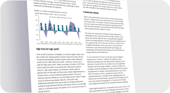 challenged and this could impact on the level of credit spreads. market would be welcome developments for emerging market Rates have done a lot of the work in pushing up corporate debt. borrowing costs. Spreads have also widened but remain below the highs seen in previous periods of stress. This means that for The Q4 equity market rally was chiefly driven by expectations similar credit ratings, today’s yields are significantly higher than of peak inflation and rates but it needs to be judged against a in recent years. This provides attractive return potential as deteriorating earnings outlook and in an environment where corporates have generally managed balance sheets well, interest rates are going to be higher than they have been for terming out debt, containing leverage levels and ensuring years. These will remain headwinds for stocks for some time. healthy interest coverage. Over the medium term, today’s Even after the significant de-rating already seen, stock markets spreads will allow investors to benefit from capital gains when are still vulnerable to the expected earnings recession. corporate fundamentals do improve. A balanced outlook Exhibit 1: Income to dominate bond returns Global Bond Market Index - Returns and Yield There is the potential for some sector and style rotation going 6.0 Price Return Income Return Yield forward. Energy stocks have outperformed on the back of high oil and gas prices. Historically, however, energy sector earnings 4.0 are more cyclical and with lower long-term growth potential 2.0 than the more dynamic new economy sectors which have been most impacted by the market de-rating. 0.0 The long-term outlook for traditional energy companies is -2.0 challenged by the momentum of the energy transition. Sure, prices may remain high but this is not guaranteed if growth -4.0 undercuts energy demand or if there are new developments on 2012 2013 2014 2015 2016 2017 2018 2019 2020 2021 the supply side (an end to the war in Ukraine; a return of Iran Source: Bloomberg LLP - ICE BofA Bond Indices and AXA IM Research, 17 November 2022 to global oil markets). At the same time, a new corporate investment cycle will eventually benefit technology and High time for high yield? automation while government policies are more focused on energy efficiency and healthcare. Core credit investment strategies can achieve higher yields with less credit risk. Subsequently investors need not chase returns It is not unheard of to have consecutive years of negative in more economically-sensitive sectors when more defensive equity returns. However, I believe the outlook is more credit sectors offer attractive yields. However, we also see a balanced; earnings are under pressure but valuations more role for high yield credit. Yields have been at levels in 2022 that attractive. Outside of the US, markets have seen significant historically have been associated with subsequent positive declines in price-earnings multiples. European markets, for returns. High yield markets are of better credit quality in example, would be well placed to rally should there be positive general than in the past and have seen similar improvements in developments in Ukraine. Asia will benefit from a post-‘Zero- credit metrics as the investment grade market. Of course, COVID’ recovery in China. Long term, however, the US defaults will rise a little but we have little concern about a large valuation premium is not likely to be challenged given the wave of refinancing-related defaults. Given the close dominance of US technology, a greater level of energy security relationship between the excess returns of high yield bonds and more positive demographics. In the near term though, (relative to government bonds) and equity returns, we see high some highly-priced parts of the US market remain vulnerable. yield as a relatively lower risk option on an eventual recovery in equity returns. Global tightening forced a revaluation across asset classes. Cash flow expectations have been challenged and investors should Chasing income be less confident about capital growth strategies as we enter 2023. Bond returns should improve relative to volatility and Higher yields can be achieved with less duration and credit risk parts of the equity market are becoming cheap. As 2023 than in recent years. That is useful in this kind of economic unfolds, there should be more clarity on the macro outlook. environment. A significant improvement in risk-adjusted This should support positive, albeit prudent, portfolio return performance for more challenged parts of the fixed income expectations. market, like emerging market debt, may have to wait until the overall outlook and risk sentiment is significantly improved. An end to the Ukraine war and a recovery in the Chinese property 6