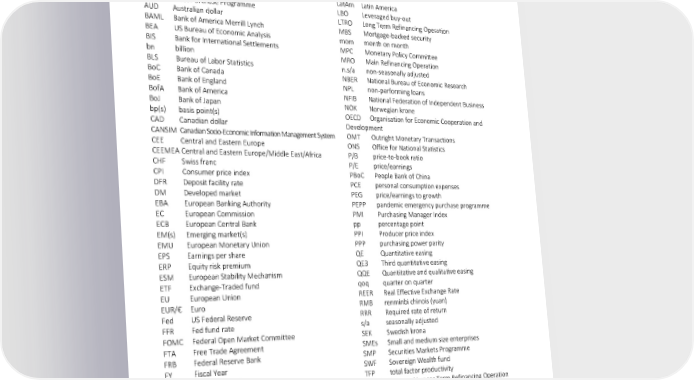Abbreviation glossary 1Q23 first quarter of 2023 IMF International Monetary Fund 1H23 first half of 2023 ISM Institute of Supply Management [Lhs] left hand scale (graph) JGB Japanese Government Bonds [Rhs] right hand scale (graph) JPY/¥ Yen a.r. annualised rate LatAm Latin America APP Asset Purchase Programme LBO Leveraged buy-out AUD Australian dollar LTRO Long Term Refinancing Operation BAML Bank of America Merrill Lynch MBS Mortgage-backed security BEA US Bureau of Economic Analysis mom month on month BIS Bank for International Settlements MPC Monetary Policy Committee bn billion MRO Main Refinancing Operation BLS Bureau of Labor Statistics n.s/a non-seasonally adjusted BoC Bank of Canada NBER National Bureau of Economic Research BoE Bank of England NPL non-performing loans BofA Bank of America NFIB National Federation of Independent Business BoJ Bank of Japan NOK Norwegian krone bp(s) basis point(s) OECD Organisation for Economic Cooperation and CAD Canadian dollar Development CANSIM Canadian Socio-Economic Information Management System OMT Outright Monetary Transactions CEE Central and Eastern Europe ONS Office for National Statistics CEEMEA Central and Eastern Europe/Middle East/Africa P/B price-to-book ratio CHF Swiss franc P/E price/earnings CPI Consumer price index PBoC People Bank of China DFR Deposit facility rate PCE personal consumption expenses DM Developed market PEG price/earnings to growth EBA European Banking Authority PEPP pandemic emergency purchase programme EC European Commission PMI Purchasing Manager Index ECB European Central Bank pp percentage point EM(s) Emerging market(s) PPI Producer price index EMU European Monetary Union PPP purchasing power parity EPS Earnings per share QE Quantitative easing ERP Equity risk premium QE3 Third quantitative easing ESM European Stability Mechanism QQE Quantitative and qualitative easing ETF Exchange-Traded fund qoq quarter on quarter EU European Union REER Real Effective Exchange Rate EUR/€ Euro RMB renminbi chinois (yuan) Fed US Federal Reserve RRR Required rate of return FFR Fed fund rate s/a seasonally adjusted FOMC Federal Open Market Committee SEK Swedish krona FTA Free Trade Agreement SMEs Small and medium size enterprises FRB Federal Reserve Bank SMP Securities Markets Programme FY Fiscal Year SWF Sovereign Wealth fund GBP/£ Pound Sterling TFP total factor productivity GDP Gross Domestic Product TLTRO Targeted Longer Term Refinancing Operation GFC Global Financial Crisis tn trillion HKD Hong Kong dollar UN United Nations HY High Yield USD/$ US dollar ICE InterContinental Exchange VAT value-added tax IG Investment Grade yoy year on year IIF Institute of International Finance ytd year to date INSEE French National Institute of Statistics and Economic WTO World Trade Organisation Studies 31