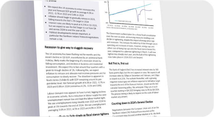 UK – Navigating troubled waters Modupe Adegbembo Exhibit 8: No more catch-up Junior Economist (G7) Real GDP forecast Macro Research – Core Investments £bn 600 Key points • We expect the UK economy to enter recession this 500 year and forecast GDP growth to average 4.3% in forecast 2022, -0.7% in 2023 and 0.8% in 2024 • Inflation should begin to gradually retrace in 2023, Trend GDP (2012-19) falling towards the BoE’s 2% target in 2024 400 • Interest rates are likely to peak at 4.25% in Q1 2023, Q1 2012 Q1 2014 Q1 2016 Q1 2018 Q1 2020 Q1 2022 Q1 2024 but we expect to see the BoE begin to cut from Q4 Source: ONS and AXA IM Research, 25 November 2022 and across 2024 to end the year at 3% • Political developments remain important, in The Government outlined plans for a sharp fiscal consolidation particular the Northern Ireland Protocol negotiations over the next six years, announcing measures totalling a net remain a risk. £62bn in tightening, despite the impact of energy price caps and recession. This reduces the deficit by £55bn through cuts in spending and increases in taxes. However, energy caps and Recession to give way to sluggish recovery other cost-of-living top-ups sees the fiscal stance loosen this year, compared to a planned tightening in March. It will now The UK economy has been flashing red for months and the tighten less sharply next year, and the bulk of the tightening recent decline in Q3 GDP, exacerbated by an additional Bank now takes place in 2024-2025 and beyond. Holiday, likely marks the beginning of a recession driven by falling consumption, and declines in business and residential BoE first in, first out investment. We expect this to last around four quarters with a peak-to-trough decline of 1%. Following this, we expect The Bank of England (BoE) has increased interest rates by 300 inflation to retrace and alleviate real incomes pressures and for basis points (bps) but the end appears in view. We expect it will consumption to slowly recover. The slowdown is apparent in increase rates by 50bps in December and February, and 25bps levels terms (Exhibit 8) with GDP remaining around its pre- in March to 4.25%. The outlook thereafter, with a growing pandemic level. We forecast growth of 4.3% in 2022, -0.7% in negative output gap and inflation expected to fall below target 2023 and 0.8% in 2024 (consensus 4.2%, -0.5% and 0.8%). towards the end of the forecast horizon, should see the BoE consider loosening policy. We anticipate 25bp cuts in each Labour demand now appears to have turned, lagging declines quarter starting in Q4 2023 bringing rates to 3% by Q4 2024. in economic activity. But a reduction in labour supply has seen The precise timing is likely to depend on the scale of labour unemployment remain low and kept the labour market tight. market adjustment. We see unemployment rising steadily over 2023 and 2024 to peak at 5% towards the end of 2024. We see unemployment Counting down to 2024’s General Election averaging 3.6% in 2022, 4.5% in 2023 and 4.9% in 2024. Negotiations between the European Union and UK on the Energy effects to fade slowly as fiscal stance tightens Northern Ireland (NI) Protocol have resumed as the Government tries to avoid another election in NI. We think Inflation has risen sharply and now stands at 11.1%. We expect second NI Assembly elections by April are likely as the a slow decline in the headline rate, with upside contributions Government seems unlikely to resolve the deadlock. Local from food inflation likely to keep the headline above double elections will also be held in May 2023 but a General Election digits into 2023. The Government’s decision to extend the should be held in 2024. Opinion polls currently suggest a energy price cap beyond March next year will help reduce Labour win. However, in contrast to recent elections, both main inflation over 2023 as a whole. We forecast Consumer Price parties have been forced back to the political centre ground Index inflation to average 9.1% in 2022, 7.6% in 2023 and 2.8% and economic orthodoxy, meaning the next election should be in 2024 (consensus 9%, 6.3% and 2.5%). the least economically damaging for a decade. 13