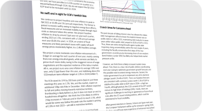 Third, mending the supply side of the economy – changing the Exhibit 7: Challenging landing at ECB’s inflation target energy mix (especially for Germany) and securing supply chains Eurozone inflation outlook – is a process that will likely take years. While uncertainty runs %yoy high, we think the quantum and/or price adjustment will result 11 10 Euro area headline inflation in a permanent supply shock. The European Commission has 9 Euro area core inflation 8 estimated Eurozone real potential growth between 1.1% and 7 1.2% since 2015 on average, consistent with a 0.3% quarterly 6 5 growth rate. Reflecting the persistent constraints the economy 4 will face, we have pencilled in 0.22% quarter-on-quarter on a 3 2 sequential basis through 2024. We do not expect the Q3 2022 1 GDP level to be recouped until Q2 2024. 0 -1 8 8 8 8 9 9 9 9 0 0 0 1 1 1 1 2 2 2 2 3 3 3 3 4 4 4 4 1 01 20120110120101202 202002202202022 02202022 02202022 02202202 No swift end in sight for ECB’s hawkish bias a-20rJun-2ep-c-ar-20Jun-2ep-c-2ar-20Jun-2p-c-2ar-20Jun-2ep-c-2ar-20Jun-2ep-c-2ar-20Jun-2ep-c-2ar-20Jun-2ep-c- M S DeM S DeM SeDeM S DeM S DeM S De M S De We continue to project headline and core inflation to peak in Source: Eurostat and AXA IM Research, 25 November 2022 Q4 2022 at 10.8% and 5% (annual) respectively. The former is poised to recede swiftly owing to negative energy base effects, Crunch times for Eurozone ahead fiscal measures and an increased inability to pass through input costs as demand falters this winter. We project headline The past decade of falling interest rates has allowed the Italian inflation to drop by around 2ppt year-on-year each quarter, debt management office to lower the implicit interest rate on ending 2023 at 2.5%, consistent with a 5.6% annual average public debt to 2.4% in 2021, maintaining debt maturity to seven next year (8.6% this year). In 2024, an unwind of fiscal years while Italian public debt jumped to 151% of GDP in 2021. measures and likely persistent issues with supply will push Thus, there are some strong firewalls against public debt energy prices moderately higher, to a 2.4% headline average. trajectory rising uncontrollably within the next couple of years, including the fiscally conservative first steps of the new We project a more moderate core inflation retracement of c. government. A continuously decreasing share of non-resident 0.6ppt on average for each quarter of next year, mainly coming bond holders (under 30%) has likely also helped limit market from non-energy industrial goods, while services are likely to pressure so far. prove much more sticky owing to the staggered nature of wage negotiations and the expected resilience of the labour market. However, we think there is likely increased market stress All in, we project euro area core inflation to average 3.8% next ahead. First, there is a clear risk of public deficits overshooting year, only 0.1ppt lower than this year, and stabilising above the next year owing to optimistic government growth forecasts and ECB medium term inflation target at 2.3% in 2024 (Exhibit 7). the possible need to extend energy measures. Second, the Italian government has yet to implement any of its electoral The ECB raised its DFR by 200 basis points (bps) in just three pledges (worth 2%-4% of GDP). Third, our baseline forecasts meetings this year, to 1.5%. We, and the market, expect an are consistent with a primary surplus worth 2.1% of GDP to additional 50bp rate hike in December. With inflation expected stabilise the public debt-to-GDP ratio in 2024 – a high bar. to fall and policy moving towards restrictive territory, Fourth, although gradual, the ECB’s unwind of the APP would frontloading is likely behind us, but it does not mean an end to reduce its high share of holdings (26%). Finally, there are hawkishness altogether. We think the ECB is likely to shift to significant challenges to reaching an agreement on future fiscal 25bp increases in February and in March to reach 2.5%, which rules after the EC issued initial guidelines, which could be would be some way below the peak rate the market is pricing detrimental to fiscal credibility. of 2.9% in mid-2023 – yet still in restrictive territory. After general elections in Greece, Finland and Spain next year, the European Parliament will be up for renewal in spring 2024. The ECB’s policy focus is likely to switch to Asset Purchase By then, we will have more experience of enhanced mutualised Programme (APP) unwind next year. Prior to high level debt in Europe with NGEU in the last third of its expected life. guidelines to be communicated at the December meeting, we Alongside heightened market pressure from challenging public think the ECB is unlikely to make a concrete decision on a path debt trajectories, EU institutions will likely face a renewed before its March 2023 meeting at the earliest. We expect crunch time amid ever-polarised voters. gradual, partial reinvestment, before picking up the pace towards year-end, mindful of already high sovereign funding rates, high public indebtedness and record expected net issuance next year. Although peripheral bond spreads have behaved well so far, we caution against complacency. 12