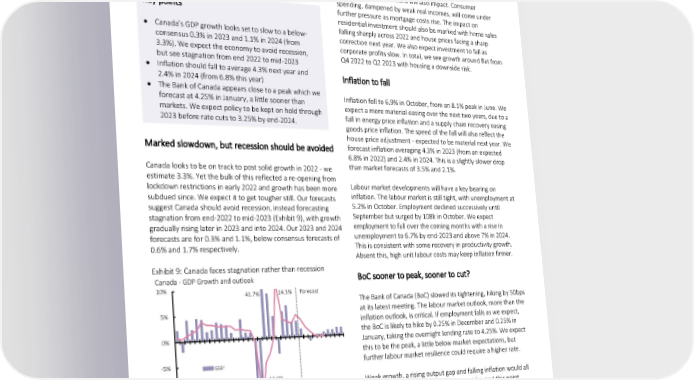 Canada – Slower activity but avoiding recession David Page exports but we see a fall in 2023. Inventory has also risen Head of Macro Research sharply, particularly in Q2, and threatens a marked reversal. Macro Research – Core Investments Tighter financial conditions will also impact. Consumer spending, dampened by weak real incomes, will come under Key points further pressure as mortgage costs rise. The impact on residential investment should also be marked with home sales • Canada’s GDP growth looks set to slow to a below- falling sharply across 2022 and house prices facing a sharp consensus 0.3% in 2023 and 1.1% in 2024 (from correction next year. We also expect investment to fall as 3.3%). We expect the economy to avoid recession, corporate profits slow. In total, we see growth around flat from but see stagnation from end 2022 to mid-2023 Q4 2022 to Q2 2023 with housing a downside risk. • Inflation should fall to average 4.3% next year and 2.4% in 2024 (from 6.8% this year) Inflation to fall • The Bank of Canada appears close to a peak which we forecast at 4.25% in January, a little sooner than Inflation fell to 6.9% in October, from an 8.1% peak in June. We markets. We expect policy to be kept on hold through expect a more material easing over the next two years, due to a 2023 before rate cuts to 3.25% by end-2024. fall in energy price inflation and a supply chain recovery easing goods price inflation. The speed of the fall will also reflect the house price adjustment - expected to be material next year. We Marked slowdown, but recession should be avoided forecast inflation averaging 4.3% in 2023 (from an expected 6.8% in 2022) and 2.4% in 2024. This is a slightly slower drop Canada looks to be on track to post solid growth in 2022 - we than market forecasts of 3.5% and 2.1%. estimate 3.3%. Yet the bulk of this reflected a re-opening from lockdown restrictions in early 2022 and growth has been more Labour market developments will have a key bearing on subdued since. We expect it to get tougher still. Our forecasts inflation. The labour market is still tight, with unemployment at suggest Canada should avoid recession, instead forecasting 5.2% in October. Employment declined successively until stagnation from end-2022 to mid-2023 (Exhibit 9), with growth September but surged by 108k in October. We expect gradually rising later in 2023 and into 2024. Our 2023 and 2024 employment to fall over the coming months with a rise in forecasts are for 0.3% and 1.1%, below consensus forecasts of unemployment to 6.7% by end-2023 and above 7% in 2024. 0.6% and 1.7% respectively. This is consistent with some recovery in productivity growth. Absent this, high unit labour costs may keep inflation firmer. Exhibit 9: Canada faces stagnation rather than recession Canada - GDP Growth and outlook BoC sooner to peak, sooner to cut? 10% 41.7% 14.3% Forecast The Bank of Canada (BoC) slowed its tightening, hiking by 50bps 5% at its latest meeting. The labour market outlook, more than the inflation outlook, is critical. If employment falls as we expect, 0% the BoC is likely to hike by 0.25% in December and 0.25% in January, taking the overnight lending rate to 4.25%. We expect this to be the peak, a little below market expectations, but -5% saar further labour market resilience could require a higher rate. yoy -12.6% -10% -38% Weak growth, a rising output gap and falling inflation would all 2016 2017 2018 2019 2020 2021 2022 2023 2024 be consistent with the BoC having to cut beyond this point. Source: CANSIM and AXA IM Macro Research, 17 November 2022 Given efforts to curb inflation, we expect the BoC will keep policy tighter for longer to ensure a return to target in 2024. As The slowdown is likely to be driven by three main factors: such, we expect the BoC to remain on hold through 2023, exports, destocking and tighter financial conditions. Export cutting in 2024 by 0.25% per quarter to 3.25% by year-end. A growth is likely to weaken as the global economy is forecast to sharper contraction in the housing market might see the BoC slow to just 2.2%, with key export markets (the US and Europe) ease rates sooner. expected to be in recession or suffering subdued growth (China). Some of this should be mitigated by Canada’s resource 14