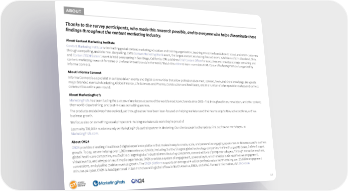 ABOUT Thanks to the survey participants, who made this research possible, and to everyone who helps disseminate these findings throughout the content marketing industry. About Content Marketing Institute Content Marketing Institute is the leading global content marketing education and training organization, teaching enterprise brands how to attract and retain customers through compelling, multichannel storytelling. CMI’s Content Marketing World event, the largest content marketing-focused event, is held every fall in Cleveland, Ohio, and ContentTECH Summit event is held every spring in San Diego, California. CMI publishes Chief Content Officer for executives and provides strategic consulting and content marketing research for some of the best-known brands in the world. Watch this video to learn more about CMI. Content Marketing Institute is organized by Informa Connect. About Informa Connect Informa Connect is a specialist in content-driven events and digital communities that allow professionals to meet, connect, learn, and share knowledge. We operate major branded events in Marketing, Global Finance, Life Sciences and Pharma, Construction and Real Estate, and in a number of other specialist markets and connect communities online year-round. About MarketingProfs MarketingProfs has been fueling the success of marketers at some of the world’s most iconic brands since 2000—first through webinars, newsletters, and other content; then world-class training; and best-in-class consulting services. The products and delivery have evolved, yet throughout we have been laser-focused on helping marketers and their teams set priorities, solve problems, and fuel business growth. We focus also on something equally important: Helping marketers do work they’re proud of. Learn why 700,000+ marketers rely on MarketingProfs as their partner in Marketing. Our clients speak for themselves. Find out how we can help you at MarketingProfs.com. About ON24 ON24 provides a leading cloud-based digital experience platform that makes it easy to create, scale, and personalize engaging experiences to drive measurable business growth. Today, we are helping over 1,900 companies worldwide, including 3 of the 5 largest global technology companies, 4 of the 5 largest US Banks, 3 of the 5 largest global healthcare companies, and 3 of the 5 largest global industrial manufacturing companies, convert millions of prospects to buyers. Through interactive webinars, virtual events, and always-on multimedia experiences, ON24 provides a system of engagement, powered by AI, which enables businesses to scale engagement, conversions, and pipeline to drive revenue growth. The ON24 platform supports an average of 4 million professionals a month totaling over 2.5 billion engagement minutes per year. ON24 is headquartered in San Francisco with global offices in North America, EMEA, and APAC. For more information, visit ON24.com. 54