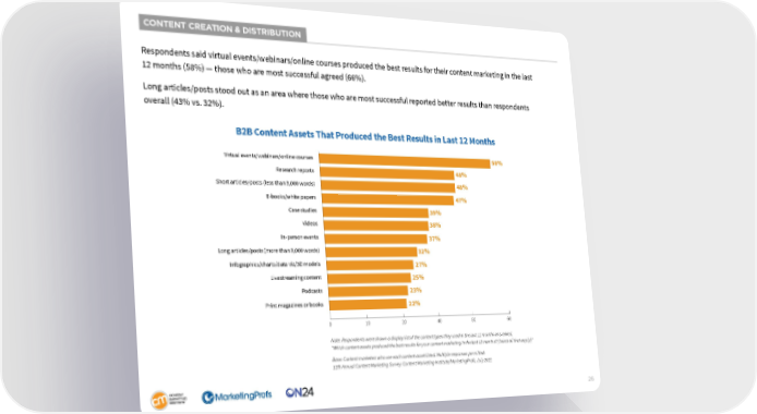 CONTENT CREATION & DISTRIBUTION Respondents said virtual events/webinars/online courses produced the best results for their content marketing in the last 12 months (58%) — those who are most successful agreed (66%). Long articles/posts stood out as an area where those who are most successful reported better results than respondents overall (43% vs. 32%). B2B Content Assets That Produced the Best Results in Last 12 Months Virtual events/webinars/online courses 58% Research reports 48% Short articles/posts (less than 3,000 words) 48% E-books/white papers 47% Case studies 39% Videos 38% In-person events 37% Long articles/posts (more than 3,000 words) 32% Infographics/charts/data viz/3D models 27% Livestreaming content 25% Podcasts 23% Print magazines or books 22% 0 10 20 40 50 60 Note: Respondents were shown a display list of the content types they used in the last 12 months and asked, “Which content assets produced the best results for your content marketing in the last 12 months? (Select all that apply.)” Base: Content marketers who use each content asset listed. Multiple responses permitted. 12th Annual Content Marketing Survey: Content Marketing Institute/MarketingProfs, July 2021 26