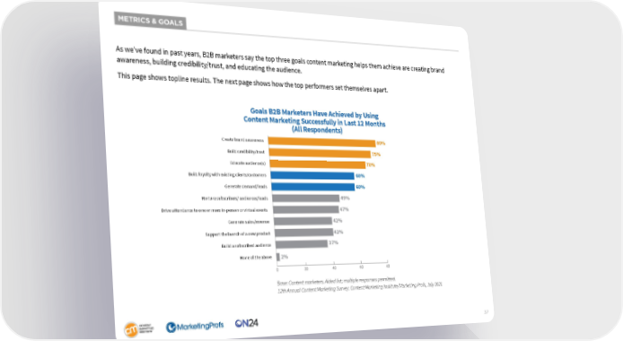 METRICS & GOALS As we’ve found in past years, B2B marketers say the top three goals content marketing helps them achieve are creating brand awareness, building credibility/trust, and educating the audience. This page shows topline results. The next page shows how the top performers set themselves apart. Goals B2B Marketers Have Achieved by Using Content Marketing Successfully in Last 12 Months (All Respondents) Create brand awareness 80% Build credibility/trust 75% Educate audience(s) 70% Build loyalty with existing clients/customers 60% Generate demand/leads 60% Nurture subscribers/ audiences/leads 49% Drive attendance to one or more in-person or virtual events 47% Generate sales/revenue 42% Support the launch of a new product 42% Build a subscribed audience 37% None of the above 2% 0 20 40 60 80 Base: Content marketers. Aided list; multiple responses permitted. 12th Annual Content Marketing Survey: Content Marketing Institute/Marketing Profs, July 2021 37