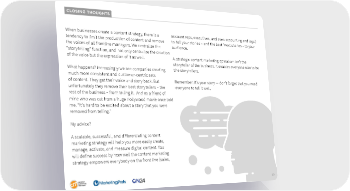 CLOSING THOUGHTS When businesses create a content strategy, there is a account reps, executives, and even accounting and legal) tendency to limit the production of content and remove to tell your stories – and the best “next stories – to your the voices of all frontline managers. We centralize the audience. “storytelling” function, and not only centralize the creation of the voice but the expression of it as well. A strategic content marketing operation isn’t the storyteller of the business. It enables everyone else to be What happens? Increasingly we see companies creating the storytellers. much more consistent and customer-centric sets of content. They get their voice and story back. But Remember: It’s your story — don’t forget that you need unfortunately they remove their best storytellers – the everyone to tell it well. rest of the business – from telling it. And as a friend of mine who was cut from a huge Hollywood movie once told me, “It’s hard to be excited about a story that you were removed from telling.” My advice? A scalable, successful, and differentiating content marketing strategy will help you more easily create, manage, activate, and measure digital content. You will define success by how well the content marketing strategy empowers everybody on the front line (sales, 50