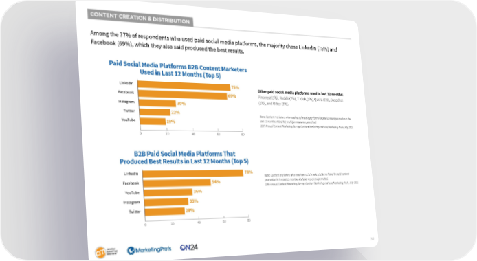 CONTENT CREATION & DISTRIBUTION Among the 77% of respondents who used paid social media platforms, the majority chose LinkedIn (75%) and Facebook (69%), which they also said produced the best results. Paid Social Media Platforms B2B Content Marketers Used in Last 12 Months (Top 5) LinkedIn 75% Other paid social media platforms used in last 12 months: Facebook 69% Pinterest (3%), Reddit (2%), TikTok (2%), Quora (1%), Snapchat Instagram 30% (1%), and Other (3%). Twitter 22% Base: Content marketers who used social media platforms for paid content promotion in the YouTube 19% last 12 months. Aided list; multiple responses permitted. 12th Annual Content Marketing Survey: Content Marketing Institute/Marketing Profs, July 2021 0 20 40 60 80 B2B Paid Social Media Platforms That Produced Best Results in Last 12 Months (Top 5) LinkedIn 79% Base: Content marketers who used the social media platforms listed for paid content Facebook 54% promotion in the last 12 months. Multiple responses permitted. 12th Annual Content Marketing Survey: Content Marketing Institute/Marketing Profs, July 2021 YouTube 36% Instagram 33% Twitter 28% 0 20 40 60 80 32