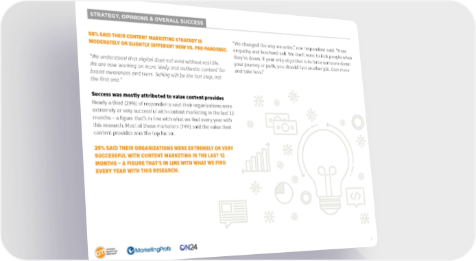 STRATEGY, OPINIONS & OVERALL SUCCESS 58% SAID THEIR CONTENT MARKETING STRATEGY IS “We changed the way we write,” one respondent said. “More MODERATELY OR SLIGHTLY DIFFERENT NOW VS. PRE-PANDEMIC. empathy and less hard sell. We don’t want to kick people when they’re down. If your only objective is to force someone down “We understood that digital does not exist without real life. your journey or path, you should find another job. Give more We are now working on more ‘daily and authentic content’ for and take less!” brand awareness and trust. Selling will be the last step, not the first one.” Success was mostly attributed to value content provides Nearly a third (29%) of respondents said their organizations were extremely or very successful with content marketing in the last 12 months – a figure that’s in line with what we find every year with this research. Most of those marketers (74%) said the value their content provides was the top factor. 29% SAID THEIR ORGANIZATIONS WERE EXTREMELY OR VERY SUCCESSFUL WITH CONTENT MARKETING IN THE LAST 12 MONTHS – A FIGURE THAT’S IN LINE WITH WHAT WE FIND EVERY YEAR WITH THIS RESEARCH. 7