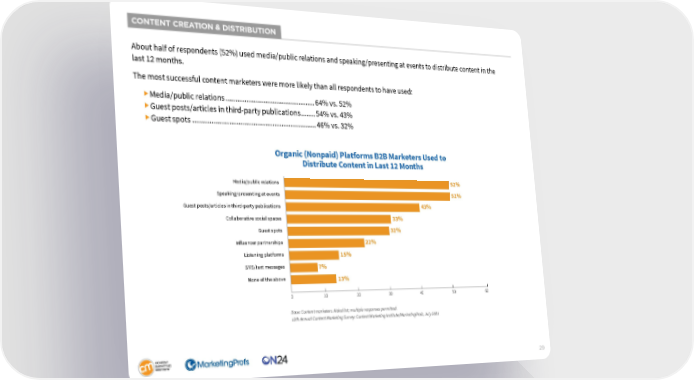 CONTENT CREATION & DISTRIBUTION About half of respondents (52%) used media/public relations and speaking/presenting at events to distribute content in the last 12 months. The most successful content marketers were more likely than all respondents to have used: Media/public relations ................................................64% vs. 52% Guest posts/articles in third-party publications ........54% vs. 43% Guest spots ..................................................................46% vs. 32% Organic (Nonpaid) Platforms B2B Marketers Used to Distribute Content in Last 12 Months Media/public relations 52% Speaking/presenting at events 52% Guest posts/articles in third-party publications 43% Collaborative social spaces 33% Guest spots 32% Influencer partnerships 22% Listening platforms 15% SMS/text messages 7% None of the above 13% 0 10 20 30 40 50 60 Base: Content marketers. Aided list; multiple responses permitted. 12th Annual Content Marketing Survey: Content Marketing Institute/MarketingProfs, July 2021 29