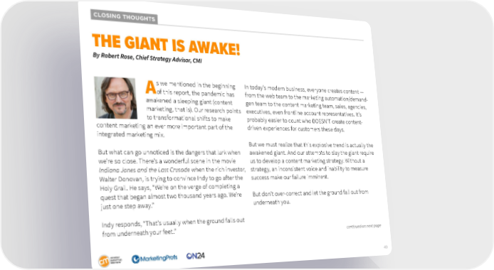 CLOSING THOUGHTS THE GIANT IS AWAKE! By Robert Rose, Chief Strategy Advisor, CMI As we mentioned in the beginning In today’s modern business, everyone creates content — of this report, the pandemic has from the web team to the marketing automation/demand- awakened a sleeping giant (content gen team to the content marketing team, sales, agencies, marketing, that is). Our research points executives, even frontline account representatives. It’s to transformational shifts to make probably easier to count who DOESN’T create content- content marketing an ever more important part of the driven experiences for customers these days. integrated marketing mix. But we must realize that this explosive trend is actually the But what can go unnoticed is the dangers that lurk when awakened giant. And our attempts to slay the giant require we’re so close. There’s a wonderful scene in the movie us to develop a content marketing strategy. Without a Indiana Jones and the Last Crusade when the rich investor, strategy, an inconsistent voice and inability to measure Walter Donovan, is trying to convince Indy to go after the success make our failure imminent. Holy Grail. He says, “We’re on the verge of completing a quest that began almost two thousand years ago. We’re But don’t over-correct and let the ground fall out from just one step away.” underneath you. Indy responds, “That’s usually when the ground falls out from underneath your feet.” continued on next page 49