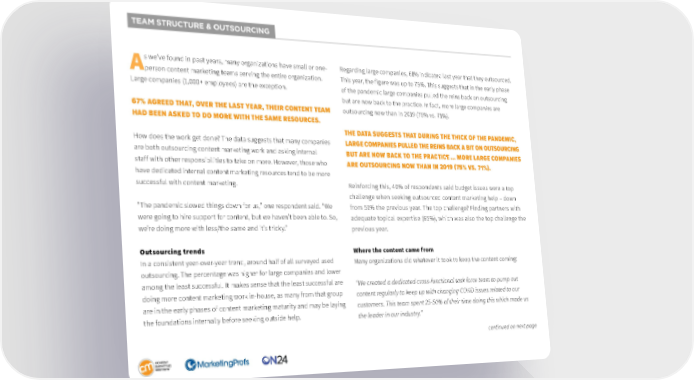 TEAM STRUCTURE & OUTSOURCING s we’ve found in past years, many organizations have small or one- Regarding large companies, 61% indicated last year that they outsourced. Aperson content marketing teams serving the entire organization. This year, the figure was up to 75%. This suggests that in the early phase Large companies (1,000+ employees) are the exception. of the pandemic large companies pulled the reins back on outsourcing but are now back to the practice. In fact, more large companies are 67% AGREED THAT, OVER THE LAST YEAR, THEIR CONTENT TEAM outsourcing now than in 2019 (75% vs. 71%). HAD BEEN ASKED TO DO MORE WITH THE SAME RESOURCES. THE DATA SUGGESTS THAT DURING THE THICK OF THE PANDEMIC, How does the work get done? The data suggests that many companies LARGE COMPANIES PULLED THE REINS BACK A BIT ON OUTSOURCING are both outsourcing content marketing work and asking internal BUT ARE NOW BACK TO THE PRACTICE … MORE LARGE COMPANIES staff with other responsibilities to take on more. However, those who ARE OUTSOURCING NOW THAN IN 2019 (75% VS. 71%). have dedicated internal content marketing resources tend to be more successful with content marketing. Reinforcing this, 40% of respondents said budget issues were a top challenge when seeking outsourced content marketing help – down “The pandemic slowed things down for us,” one respondent said. “We from 51% the previous year. The top challenge? Finding partners with were going to hire support for content, but we haven’t been able to. So, adequate topical expertise (65%), which was also the top challenge the we’re doing more with less/the same and it’s tricky.” previous year. Outsourcing trends Where the content came from In a consistent year-over-year trend, around half of all surveyed used Many organizations did whatever it took to keep the content coming: outsourcing. The percentage was higher for large companies and lower among the least successful. It makes sense that the least successful are “We created a dedicated cross-functional task force team to pump out doing more content marketing work in-house, as many from that group content regularly to keep up with changing COVID issues related to our are in the early phases of content marketing maturity and may be laying customers. This team spent 25-50% of their time doing this which made us the foundations internally before seeking outside help. the leader in our industry.” continued on next page 1212