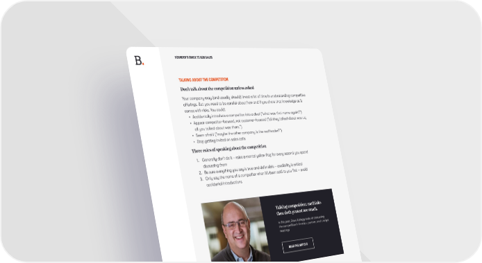 FOUNDER’S GUIDE TO B2B SALES TALKING ABOUT THE COMPETITION Don’t talk about the competition unless asked Your company may (and usually should) invest a lot of time in understanding competitive offerings. But you need to be careful about how and if you share that knowledge as it comes with risks. You could: • Accidentally introduce a competitor into a deal (“what was that name again?”) • Appear competitor-focused, not customer-focused (“all they talked about was us; all you talked about was them.”) • Seem afraid (“maybe the other company is the real leader?”) • Stop getting invited on sales calls Three rules of speaking about the competition 1. Generally don’t do it – raise a mental yellow flag for every second you spend discussing them 2. Be sure everything you say is true and defensible – credibility is critical 3. Only say the name of a competitor when it’s been said to you first – avoid accidental introductions Talking competition: methinks thou doth protest too much. In this post, Dave Kellogg looks at discussing the competition in investor, partner, and analyst meetings READ THE ARTICLE TO LEARN MORE ABOUT SELLING • The Qualified Sales Leader by John McMahon • MEDDIC & MEDDPIC by the MEDDIC Academy • The Top 18 Sales Blogs by Gong • Selling Through Curiosity by Barry Rhein via SalesHood • The Art of Asking Open-Ended Questions by Hubspot SPRING 2023 .10