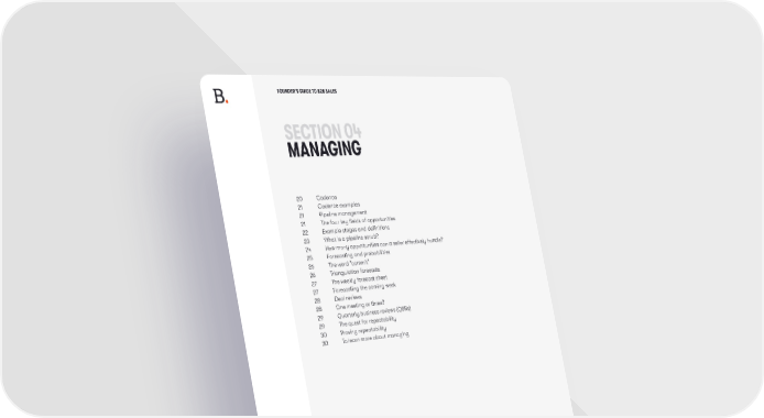 FOUNDER’S GUIDE TO B2B SALES SECTION 04 MANAGING 20 Cadence 21 Cadence examples 21 Pipeline management 21 The four key fields of opportunities 22 Example stages and definitions 23 What is a pipeline scrub? 24 How many opportunities can a seller effectively handle? 25 Forecasting and probabilities 26 The word “commit” 26 Triangulation forecasts 27 The weekly forecast sheet 27 Forecasting the coming week 28 Deal reviews 28 One meeting or three? 29 Quarterly business reviews (QBRs) 29 The quest for repeatability 30 Proving repeatability 30 To learn more about managing SPRING 2023 .19