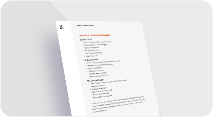 FOUNDER’S GUIDE TO B2B SALES THREE TYPES OF CUSTOMER SUCCESS MANAGERS The Best Friend • Think: “I’m here to help you use the product.” • Provides advanced technical support • Technical background • Will ask how it’s going • Won’t ask you for money • Measured on CSAT The Renewals Clerk • Think: “I’m here to collect your renewal next quarter.” • Manages the contract renewals process • Finance background • Will ask you for money • Won’t ask about expansion • Measured on churn reduction The Account Manager • Think: “I’m here to maximise your value from the software.” • Manages an account • SDR/sales background • Sees value as driver of renewal • Will ask* about expansion • Measured on account growth *Looking for expansion opportunities is not the same thing as selling them. Depending on your model, CS managers may find opportunities and hand-off to sales. They may handle the opportunities themselves, or they may work with sales in order to sell the opportunity together. SPRING 2023 .33