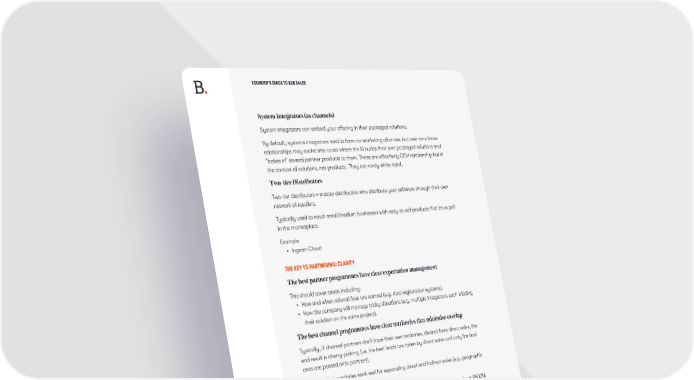 FOUNDER’S GUIDE TO B2B SALES System Integrators (as channels) System integrators can embed your offering in their packaged solutions. By default, systems integrators tend to form co-marketing alliances, but over time those relationships may evolve into cases where the SI builds their own packaged solutions and “bakes in” several partner products to them. These are effectively OEM relationship but in the context of solutions, not products. They are rarely white-label. Two-tier Distributors Two-tier distributors = master distributors who distribute your software through their own network of resellers. Typically used to reach small/medium businesses with easy-to-sell products that have pull in the marketplace. Example • Ingram Cloud THE KEY TO PARTNERING: CLARITY The best partner programmes have clear expectation management This should cover areas including: • How and when referral fees are earned (e.g. deal registration systems). • How the company will manage tricky situations (e.g. multiple integrators each bidding their solution on the same project). The best channel programmes have clear territories that minimise overlap Typically, if channel partners don’t have their own territories, distinct from direct sales, the end result is cherry-picking (i.e. the best leads are taken by direct sales and only the bad ones are passed onto partners). Geographic boundaries work well for separating direct and indirect sales (e.g. geographic distributors). Size floors work well within geographies (e.g. direct sales only to companies about $500M in revenue). SPRING 2023 .48