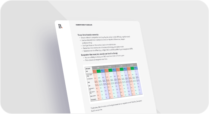 FOUNDER’S GUIDE TO B2B SALES To use benchmarks correctly: • Ensure relevant comparison set (e.g. by size, sales model, ARR size, capital raised) • Use benchmarks from multiple sources (to help find differences, deepen understanding) • Don’t just focus on the median, look at the distribution • Remember that metrics are a function of strategy and sales model • Variances can be offset (e.g. a high CAC could be justified by an exceptional NRR) Remember that many key metrics are hard to change • You are unlikely to drop your CAC ratio from 2.2x to 1.1x in a year • Think about convergence over time *Estimates, Benchmarks and Analysis based on our experience with leading European SaaS companies SPRING 2023 .56