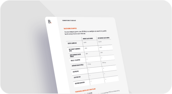 FOUNDER’S GUIDE TO B2B SALES SALES MODEL EXAMPLES As your company grows, you will likely run multiple sales models in parallel, but it’s always best to start with one. INSIDE SALES MODEL ENTERPRISE SALES MODEL QUOTA (ANNUAL) $600K $1,200K ON-TARGET EARNINGS $150K $300K (OTE) ASP (AVERAGE SALES $25K $175K PRICE) DEALS / QUARTER 6 2 AVERAGE SALES CYCLE 60 days 240 days AES PER SC 4 2 ASP PER SDR 4 2 AES PER MANAGER 8 6 TERRITORIES, QUOTAS AND COMP PLANS Key compensation elements • Base/variable weighting: percentage of on-target earnings (OTE) that is base salary vs. bonus • Typically 50/50 for sales, 66/33 for SDRs, and 70/30 for SCs (although it does vary, particularly for SCs) Quota/OTE ratio • Sellers typically have a ratio of quota to OTE of 4:1 • For example, a position with a $1M ARR quota has $250K OTE Quota vs. territory is a philosophical issue • Equal quotas: assign equal quotas and try to carve territories with equal opportunity • Variable quotas: assign variable quotas as a function of the opportunity within them Small deals to a large audience suggests equal quotas while targeted vertical or account-based sales suggests variable quotas. SPRING 2023 .16