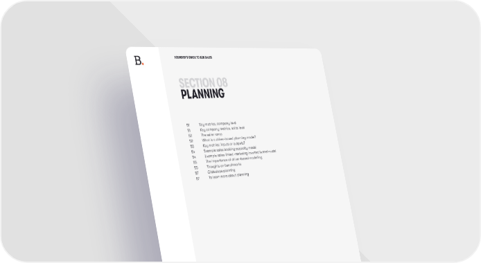 FOUNDER’S GUIDE TO B2B SALES SECTION 08 PLANNING 51 Key metrics, company level 51 Key company metrics, sales level 52 The seller ramp 52 What is a driver-based planning model? 53 Key metrics: inputs or outputs? 54 Example sales booking capacity model 54 Example sales-linked marketing inverted funnel model 55 The importance of driver-based modelling 55 Thoughts on benchmarks 57 Glideslope planning 57 To learn more about planning SPRING 2023 .50