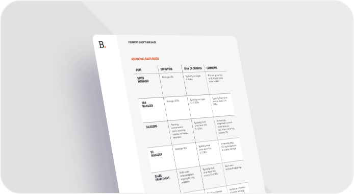 FOUNDER’S GUIDE TO B2B SALES ADDITIONAL SALES ROLES ROLE DEFINITION SPAN OF CONTROL COMMENTS SALES Manages AEs Typically manages This can go as high MANAGER 6–8 AEs as 10-12 with inside sales models SDR Manages SDRs Typically manages Typically hired when MANAGER 8–12 SDRs team is round 3–4 SDRs SALESOPS Planning, Typically hired Increasingly compensation when team hits integrated to overall plans, reporting, 6-10 AEs revops function metrics, territories, (e.g. sales, marketing, deal desk success, PS) SC Manages SCs Typically hired In the early days, MANAGER when team hits SCs typically report 6-10 SCs to a sales manager SALES Builds sales Typically hired Also known ENABLEMENT onboarding and when team hits as Sales Productivity ongoing training around 10-20 AEs programs ALLIANCES Builds relationships 10:1 AE to alliances Staffed as a function with ecosystem staff ratio of partner strategy co-sell partners and can vary widely SPRING 2023 .17