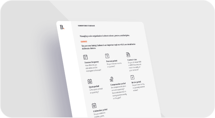 FOUNDER’S GUIDE TO B2B SALES Managing a sales organisation is about cadence, process, and discipline. CADENCE You are your timing. Cadence is an important topic on which you should make deliberate choices. Forecast frequency Forecast period Contract value How often do you Do you forecast months Do you talk about MRR ask sellers and/or or quarters? or ARR? Does that unit managers to forecast? match the reality of your contracts? Quota period Compensation period Review period Is the quota annual Are compensation plans Do you have monthly or quarterly? annual or quarterly? or quarterly business Do accelerators kick-in reviews? during quarters or only on the year? Celebration period Do you celebrate months, years, or quarters? For the rest of this guide, we will, by default, assume a quarterly cadence, larger deals, with 2-3 quarter sales cycles. Please map to your situation accordingly. SPRING 2023 .20