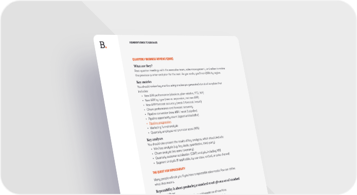 FOUNDER’S GUIDE TO B2B SALES QUARTERLY BUSINESS REVIEWS (QBRS) What are they? Post-quarter meetings with the executive team, sales management, and sellers to review the previous quarter and plan for the next. As you scale, you’ll run QBRs by region. Key metrics You should review key metrics using a salesops-generated standard template that includes: • New ARR performance (absolute, plan-relative, YTD, YoY) • New ARR by type (new vs. expansion, net new ARR) • New ARR forecast accuracy (week 3 forecast / result) • Churn performance and forecast accuracy • Pipeline conversion (new ARR / week 3 pipeline) • Pipeline opportunity count (opportunities/seller) • Pipeline progression • Marketing funnel analysis • Quarterly employee net promoter score (NPS) Key analyses You should also present the results of key analyses, which should include: • Win/loss analysis (e.g. key deals, quantitative, third-party) • Churn analysis (via some taxonomy) • Quarterly customer satisfaction (CSAT) analysis, including NPS • Segment analysis (if applicable, by use-case, vertical, or sales channel) THE QUEST FOR REPEATABILITY Many people will ask you if you have a repeatable sales model. Few can define what that means. Repeatability is about producing a standard result given a set of standard inputs such as: • Standard hiring profile – background/experience of new hires • Standard training program – onboarding, but also ongoing • Standard support ratios – SCs, SDRs, managers, alliances • Standard territory • Standard kit – messaging, presentations, demonstrations, collateral • Standard sales process – and, as you get bigger, a sales methodology Can you produce a standard result? • For example, an 80% chance of a seller producing at 80%+ of quota in one year. SPRING 2023 .29