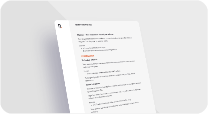 FOUNDER’S GUIDE TO B2B SALES Channels – these are partners who sell your software They sell your software either standalone or as an embedded component in their software. They also “take the paper” on customer orders. Example • An international distributor in Japan • A software vendor who embeds your reporting solution TYPES OF ALLIANCES Technology Alliances These are ecosystem partners who build complementary products that customers use in conjunction with yours. Example • A data catalogue vendor’s relationship with Snowflake These typically involve co-marketing, salesforce education, and potentially, referral agreements. System Integrators These are services firms that vary from small, focused boutiques to large regional or global system integrators (SIs). Regardless of size, they make money in the same way — by selling services to implement software or transformation initiatives. Example • CFO Solutions (boutique), Slalom (mid-size), Deloitte (Big Four) These alliances typically co-sell relationships by joint bidding on projects with co- marketing. TYPES OF CHANNELS Geographic distributors Geographic distributors sell your software in a given region or geography, often on an exclusive or de facto exclusive basis. They are typically used to help you get started in a region where you cannot yet afford to build a direct operation. Original Equipment Manufacturers (OEMs) While the term dates back to physical manufacturing (e.g. putting my company’s compressors in your refrigerators), the term OEM is still used today in software, with the same conceptual definition: OEMs embed your software in their offering. These are long-term supplier relationships with a long sales cycle that hopefully result in a “design win.” The OEM then develops their product, ships it, and pays your company royalties which are usually a mix of prepaid and ongoing. These are called “white label” relationships when your product is rebranded. For example, NetSuite Planning for many years was a white label version of Adaptive Planning. SPRING 2023 .47