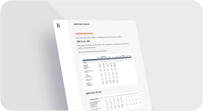 FOUNDER’S GUIDE TO B2B SALES QBR METRICS AND ANALYSES Examples of key metrics tables not already presented in the previous sections. QBR Metrics, ARR Post-quarter meetings with exec team, sales management, and sellers to review the last quarter and plan for the next. As you scale, review by territory and/or region. QBR Metrics, Pipeline MICROSOFT EXCEL See video: Dave Kellogg, Executive in Residence at Balderton Capital, on how to build a marketing machine SPRING 2023 .59
