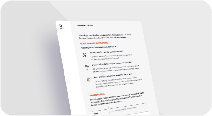 FOUNDER’S GUIDE TO B2B SALES Marketing is a complex field which could have its own playbook. This section focuses on the part of marketing closest to sales: demand generation. THE WORLD’S SHORTEST MARKETING PRIMER Marketing lives at the intersection of three things: Business benefits – why buy a product or service? It provides a solution to business problems, it’s better/cheaper/faster and there are customer testimonials as proof Product differentiation – why buy your product or service? This comes down to your high-level product positioning, agenda-setting your differentiating features and mapping unique features to customer problems Buyer priorities – why give my product the time of day? The best marketing talks to customers about what’s important to them. Successful marketers research the areas which top their customers’ pain point list and they map these problems to their company’s solutions THE MARKETING FUNNEL Like sales, marketing has a funnel. It starts with names (or contacts) and finishes with opportunities, which are passed to sales to hopefully become won deals. Below is an example of a marketing funnel. NAME A person we found to potentially add to the database. RESPONSE A person who responded to a campaign (“hand raiser”). NET NEW LEAD Not duplicate. Not garbage (e.g. [email protected]), within a target market. MARKETING Meets the agreed tests to be passed to SDR. Often some combination of QUALIFIED LEAD demographic (e.g. CFO title at 500+ person company) and behavioural (MQL) scoring (e.g. downloaded evaluation guide, attended weekly demo). STAGE 1 SDR-qualified, usually via some form of BANT qualification. OPPTY STAGE 2 Sales-accepted lead (SAL), indicating that a seller concurs OPPTY it is a valid opportunity. DEAL Closed / won opportunities. (For the definition of BANT qualification, see here.) SPRING 2023 .39
