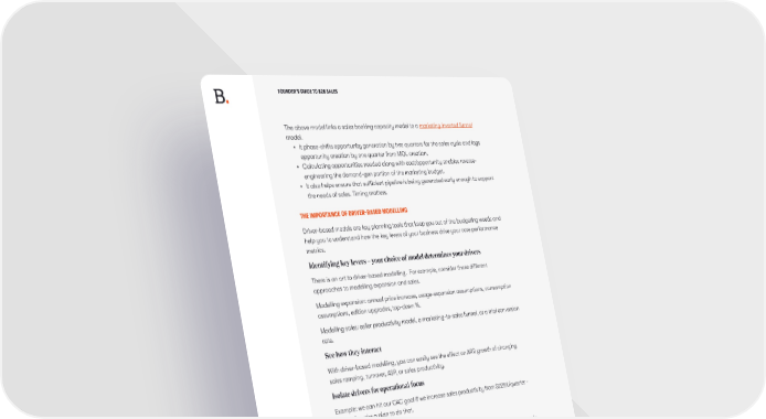 FOUNDER’S GUIDE TO B2B SALES The above model links a sales booking capacity model to a marketing inverted funnel model. • It phase-shifts opportunity generation by two quarters for the sales cycle and lags opportunity creation by one quarter from MQL creation. • Calculating opportunities needed along with cost/opportunity enables reverse- engineering the demand-gen portion of the marketing budget. • It also helps ensure that sufficient pipeline is being generated early enough to support the needs of sales. Timing matters. THE IMPORTANCE OF DRIVER-BASED MODELLING Driver-based models are key planning tools that keep you out of the budgeting weeds and help you to understand how the key levers of your business drive your core performance metrics. Identifying key levers – your choice of model determines your drivers There is an art to driver-based modelling. For example, consider these different approaches to modelling expansion and sales. Modelling expansion: annual price increase, usage-expansion assumptions, consumption assumptions, edition upgrades, top-down %. Modelling sales: seller productivity model, a marketing-to-sales funnel, or a trial conversion rate. See how they interact With driver-based modelling, you can easily see the effect on ARR growth of changing sales ramping, turnover, ASP, or sales productivity. Isolate drivers for operational focus Example: we can hit our CAC goal if we increase sales productivity from $225K/quarter - now, let’s make a plan to do that. Enable scenario analysis You can define scenarios by picking logically consistent sets of driver values. For example, mid-market push vs. enterprise expansion. Establish a three-year trajectory The top planning mistake is to make an optimistic P&L for Year 1 that under-invests to support growth in year 2. With a three-year model, you are always looking at a longer trajectory to avoid this problem. Don’t drive looking at the hood ornament! THOUGHTS ON BENCHMARKS Benchmarks are a necessary evil in B2B sales • They’re necessary because they help with comparison to industry norms and can inspire improvement • Evil because they are easily misinterpreted and/or cherry-picked SPRING 2023 .55