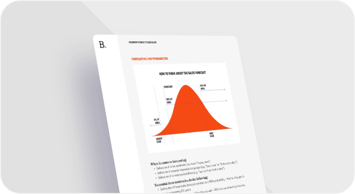 FOUNDER’S GUIDE TO B2B SALES FORECASTING AND PROBABILITIES When it comes to forecasting: • Sellers tend to be optimistic (i.e. have “happy ears”) • Sellers tend towards imprecise language (e.g. “best case” or “if the stars align”) • Sellers tend to resist probabilities (e.g. “we can’t win half a deal”) To combat these tendencies, do the following: • Define the VP-level sales forecast number as a 90% probability – that is, they get to miss it once every 2.5 years • If you also want a best-case, define that as well – 90% chance of beating forecast, 20% chance of beating best-case • Use forecast category as probability of individual deals closing Define the forecast in terms of probabilities, but do not impose rules on how the forecast is made. • Most sales leaders use scenario analysis to arrive at their forecast. You should consider their forecast an independent prediction; use triangulation to see the bigger picture. How to train your VP of Sales to think about the forecast In this article, Dave Kellogg asks you to imagine this conversation in a Board Meeting between a Director and a VP of Sales. READ SPRING 2023 .25