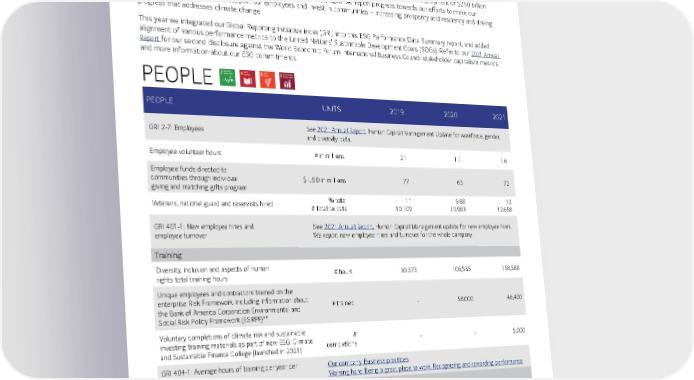 3 Measuring Progress Against Our Environmental, Social, and Governance Goals The Bank of America Environmental, Social, and Governance (ESG) approach is integrated into each of our eight lines of business and helps define how we pursue business opportunities and manage risk. In 2021, our longstanding commitment to racial equality *, a low-carbon transition and community support was reinforced by our Net Zero announcement and deployment of $250 billion toward a $1.5 trillion Sustainable Finance goal. In the following pages, we report progress towards our efforts to make our operations more sustainable, support our employees and invest in communities – increasing prosperity and resiliency and driving progress that addresses climate change. This year we integrated our Global Reporting Initiative index (GRI) into this ESG Performance Data Summary report, and added alignment of various performance metrics to the United Nations’ Sustainable Development Goals (SDGs). Refer to our 2021 Annual Report for our second disclosure against the World Economic Forum International Business Council stakeholder capitalism metrics. and more information about our ESG commitments. PEOPLE PEOPLE UNITS 2019 2020 2021 GRI 2-7: Employees See 2021 Annual Report , Human Capital Management Update for workforce, gender, and diversity data. Employee volunteer hours # in millions 2.1 1.1 1.6 Employee funds directed to communities through individual giving and matching gifts program $ USD in millions 77 65 72 Veterans, national guard and reservists hired % total 11 6.68 12 # total to date 10,109 10,983 12,658 GRI 401-1: New employee hires and employee turnover See 2021 Annual Report , Human Capital Management update for new employee hires. We report new employee hires and turnover for the whole company. Training Diversity, inclusion and aspects of human rights total training hours # hours 90,575 108,535 158,580 Unique employees and contractors trained on the enterprise Risk Framework, including information about the Bank of America Corporation Environmental and Social Risk Policy Framework (ESRPF)** # trained - 58,000 46,400 Voluntary completions of climate risk and sustainable investing training materials as part of new ESG, Climate and Sustainable Finance College (launched in 2021) # completions - - 5,000 GRI 404-1: Average hours of training per year per employee Our company, Business practices Working here, Being a great place to work, Recognizing and rewarding performance Employee Benefits and Health GRI 401-2: Benefits provided to full-time employees that are not provided to temporary or part-time employees Working here, Being a great place to work, Wellness & benefits Working here, Being a great place to work, Recognizing and rewarding performance GRI 401-3: Parental leave Working here, Being a great place to work, Wellness & benefits *This commitment increased to $1.25 billion as of March 2021. **The company has established an enterprise Risk Framework training, which is required for all employees and contractors and provides an in-depth overview of how we manage risk.This includes background on the types of risks we face and presents awareness on the diff erent programs and processes we have in place to help mitigate these risks, including the ESRPF.