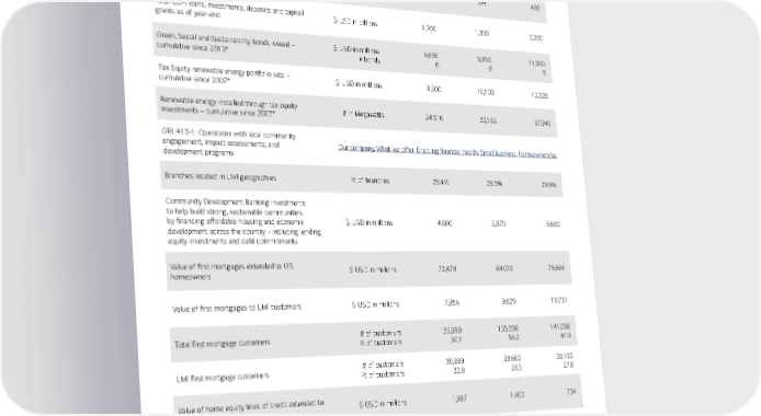 11 UNITS 2019 2020 2021 Total Community Development Financial Institutions (CDFIs) with loans, investments, deposits and/or capital grants as of year-end # of CDFIs 254 256 252 CDFI loans, investments, deposits and/or capital grants that closed during the year $ USD in millions 337 394 400 Total CDFI loans, investments, deposits and capital grants as of year-end $ USD in billions 1,700 1,800 2,200 Green, Social and Sustainability bonds issued – cumulative since 2013* $ USD in millions 6,850 9,850 11,900 # bonds 6 8 9 Tax Equity renewable energy portfolio size – cumulative since 2007* $ USD in millions 8,500 10,100 12,328 Renewable energy installed through tax equity investments – cumulative since 2007* # in Megawatts 24,916 33,163 37,940 GRI: 413-1: Operations with local community engagement, impact assessments, and development programs Our company, What we offer, Enabling financial health ; Small business ; Homeownership Branches located in LMI geographies % of branches 29.4% 29.5% 29.9% Community Development Banking Investments to help build strong, sustainable communities by financing affordable housing and economic development across the country – including lending, equity investments and debt commitments $ USD in millions 4,880 5,870 6,600 Value of first mortgages extended to U.S. homeowners $ USD in millions 72,478 69,053 79,684 Value of first mortgages to LMI customers $ USD in millions 7,956 9,829 10,731 Total first mortgage customers # of customers 135,900 135,598 141,098 % of customers 50.1 56.2 61.9 LMI first mortgage customers # of customers 30,999 38,662 39,193 % of customers 22.8 28.5 27.8 Value of home equity lines of credit extended to LMI customers $ USD in millions 1,987 1,403 734 Total credit to small business owners (new and renewal) $ USD in millions 38,900 50,300 34,800 New credit to small business owners $ USD in millions 9,185 5,058 9,333 *Cumulative values expressed within this report leverage historic methods to derive and / or estimate values. Methodologies and internal control frameworks regarding value reporting continue to evolve.
