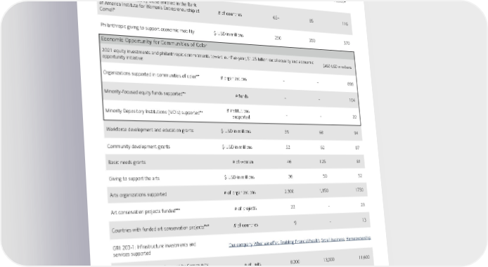 10 PROSPERITY UNITS 2019 2020 2021 Women supported through ESG programs and partnerships (e.g. Cornell, Tory Burch Foundation, Cherie Blair, Kiva)* # of women 19,000+ 50,000+ 75,000+ Countries represented by those enrolled in the Bank of America Institute for Women’s Entrepreneurship at Cornell* # of countries 65+ 85 116 Philanthropic giving to support economic mobility $ USD in millions 250 350 370 Economic Opportunity for Communities of Color 2021 equity investments and philanthropic commitments toward our five-year, $1.25 billion racial equality and economic opportunity initiative: $450 USD in millions Organizations supported in communities of color** # organizations - - 896 Minority-focused equity funds supported** # funds - - 104 Minority Depository Institutions (MDIs) supported** # institutions supported - - 22 Workforce development and education grants $ USD in millions 59 68 94 Community development grants $ USD in millions 52 62 87 Basic needs grants # of women 46 125 81 Giving to support the arts $ USD in millions 36 50 52 Arts organizations supported # of organizations 2,300 1,850 1750 Art conservation projects funded*** # of projects 22 - 23 Countries with funded art conservation projects*** # of countries 9 - 13 GRI: 203-1: Infrastructure investments and services supported Our company, What we offer, Enabling financial health ; Small business ; Homeownership Affordable housing units financed by Community Development Banking # of units 8,200 13,000 11,600 *Cumulative values expressed within this report leverage historic methods to derive and / or estimate values. Methodologies and internal control frameworks regarding value reporting continue to evolve. **Tracking for these data points began in 2021 as it relates to the five-year, $1.25 billion commitment to racial equality and economic opportunity. ***No grants awarded in 2020 as funds were reallocated to support the critical operating needs for arts partners.