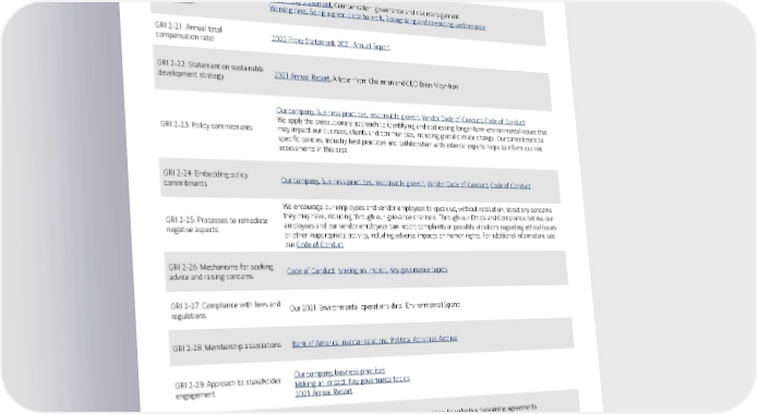 8 GRI 2-18: Evaluation of the performance of the highest governance body 2022 Proxy Statement GRI 2-19: Remuneration policies 2022 Proxy Statement , Compensation governance and risk management Working here, Being a great place to work, Recognizing and rewarding performance GRI 2-20: Process to determine remuneration 2022 Proxy Statement , Compensation governance and risk management Working here, Being a great place to work, Recognizing and rewarding performance GRI 2-21: Annual total compensation ratio 2022 Proxy Statement ; 2021 Annual Report GRI 2-22: Statement on sustainable development strategy 2021 Annual Report , A letter from Chairman and CEO Brian Moynihan GRI 2-23: Policy commitments Our company, Business practices, responsible growth ; Vendor Code of Conduct ; Code of Conduct We apply the precautionary approach to identifying and addressing longer-term environmental issues that may impact our business, clients and communities, including global climate change. Our commitment to specific policies, industry best practices and collaboration with external experts helps to inform our risk assessments in this area. GRI 2-24: Embedding policy commitments Our company, Business practices, responsible growth , Vendor Code of Conduct ; Code of Conduct GRI 2-25: Processes to remediate negative aspects We encourage our employees and vendor employees to speak up, without retaliation, about any concerns they may have, including through our grievance channels. Through our Ethics and Compliance hotline, our employees and our vendor employees can report complaints or possible violations regarding ethical issues or other inappropriate activity, including adverse impacts on human rights. For additional information, see our Code of Conduct . GRI 2-26: Mechanisms for seeking advice and raising concerns Code of Conduct ; Making an impact, Key governance topics GRI 2-27: Compliance with laws and regulations Our 2021 Environmental operations data, Environmental Spend GRI 2-28: Membership associations Bank of America investor relations, Political Activities Archive GRI 2-29: Approach to stakeholder engagement Our company, business practices Making an impact, Key governance topics 2021 Annual Report GRI 2-30: Collective bargaining agreements Direct response: No U.S.-based employees are subject to collective bargaining agreements. GRI 205-1: Operations assessed for risks Business units are routinely analyzed for risks related to corruption. GRI 205-2: Communication and training about anti-corruption policies and procedures Bank of America employees are regularly trained in anti-corruption policies as part of our Code of Conduct training.