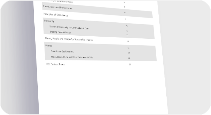 Contents Measuring Against Our Environmental, Social and Governance Goals 3 People 3 Training 3 Employee Benefits and Health 3 Planet Goals and Performance 6 Principles of Governance 7 Prosperity 10 Economic Opportunity for Communities of Color 10 Enabling Financial Health 13 Planet, People and Prosperity: Sustainable Finance 14 Planet 15 Greenhouse Gas Emissions 17 Paper, Water, Waste, and Other Environmental Data 23 GRI Content Index 28
