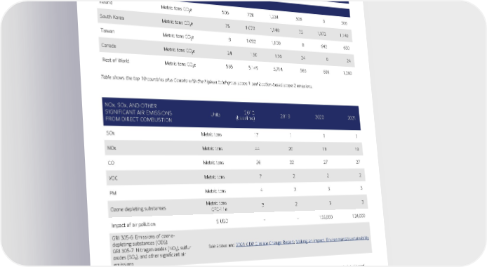 20 GREENHOUSE GAS EMISSIONS BY REGION Units Scope 1 direct emissions Scope 2 indirect emissions Total Scope 1 and Scope 2 emissions Scope 1 direct emissions Scope 2 indirect emissions Total Scope 1 and Scope 2 emissions 2021 GROSS LOCATION-BASED EMISSIONS 2021 GROSS MARKET-BASED EMISSIONS GREENHOUSE GAS EMISSIONS BY COUNTRY Ireland Metric tons CO 2 e 506 728 1,234 506 0 506 South Korea Metric tons CO 2 e 75 1,073 1,148 75 1,073 1,148 Taiwan Metric tons CO 2 e 8 1,092 1,100 8 642 650 Canada Metric tons CO 2 e 24 150 174 24 0 24 Rest of World Metric tons CO 2 e 565 5,149 5,714 565 696 1,260 Table shows the top 10 countries plus Canada with the highest total gross scope 1 and location-based scope 2 emissions. NOx, SOx, AND OTHER SIGNIFICANT AIR EMISSIONS FROM DIRECT COMBUSTION Units 2010 (baseline) 2019 2020 2021 SOx Metric tons 17 1 1 1 NOx Metric tons 44 20 19 19 CO Metric tons 56 32 27 27 VOC Metric tons 7 2 2 2 PM Metric tons 4 3 3 3 Ozone depleting substances Metric tons CFC-11e 3 2 3 3 Impact of air pollution $ USD - - 135,000 134,000 GRI 305-6: Emissions of ozone- depleting substances (ODS) GRI 305-7: Nitrogen oxides (NO X ), sulfur oxides (SO X ), and other significant air emissions See above and 2021 CDP Climate Change Report ; Making an impact, Environmental sustainability Data are sourced from the Scope 1 and 2 inventory and records kept through our compliance program. Significant air emissions are calculated based on site-specific data and published emission factors. We use the same boundary in calculating these air emissions as in our greenhouse gas emissions calculations. R-22 is an ozone depleting substance with a high global warming potential. BAC destroys R-22 from our operations when we decommission equipment instead of re-selling to encourage the complete phase out of R-22 from the market. The impact of air pollution (SOx, NOx, CO, VOCs, and PM) is calculated using social cost factors of each pollutant as reported in the World Resources Institute ’s Transport Emissions & Social Cost Assessment Tool v 1.0.