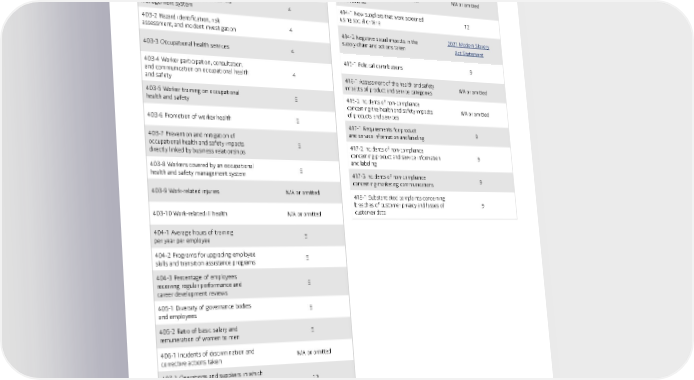 30 401-2 Benefits provided to full-time employees that are not provided to temporary or part-time employees 3 401-3 Parental leave 3 402-1 Minimum notice periods regarding operational changes N/A or omitted 403-1 Occupational health and safety management system 4 403-2 Hazard identification, risk assessment, and incident investigation 4 403-3 Occupational health services 4 403-4 Worker participation, consultation, and communication on occupational health and safety 4 403-5 Worker training on occupational health and safety 5 403-6 Promotion of worker health 5 403-7 Prevention and mitigation of occupational health and safety impacts directly linked by business relationships 5 403-8 Workers covered by an occupational health and safety management system 5 403-9 Work-related injuries N/A or omitted 403-10 Work-related ill health N/A or omitted 404-1 Average hours of training per year per employee 5 404-2 Programs for upgrading employee skills and transition assistance programs 5 404-3 Percentage of employees receiving regular performance and career development reviews 5 405-1 Diversity of governance bodies and employees 5 405-2 Ratio of basic salary and remuneration of women to men 5 406-1 Incidents of discrimination and corrective actions taken N/A or omitted 407-1 Operations and suppliers in which the right to freedom of association and collective bargaining may be at risk 12 408-1 Operations and suppliers at significant risk for incidents of child labor 2021 Modern Slavery Act Statement 409-1 Operations and suppliers at significant risk for incidents of forced or compulsory labor 2021 Modern Slavery Act Statement 410-1 Security personnel trained in human rights policies or procedures 2021 Modern Slavery Act Statement 411-1 Incidents of violations involving rights of indigenous peoples N/A or omitted 413-1 Operations with local community engagement, impact assessments, and development programs 11 413-2 Operations with significant actual and potential negative impacts on local communities N/A or omitted 414-1 New suppliers that were screened using social criteria 12 414-2 Negative social impacts in the supply chain and actions taken 2021 Modern Slavery Act Statement 415-1 Political contributions 9 416-1 Assessment of the health and safety impacts of product and service categories N/A or omitted 416-2 Incidents of non-compliance concerning the health and safety impacts of products and services N/A or omitted 417-1 Requirements for product and service information and labeling 9 417-2 Incidents of non-compliance concerning product and service information and labeling 9 417-3 Incidents of non-compliance concerning marketing communications 9 418-1 Substantiated complaints concerning breaches of customer privacy and losses of customer data 9 Disclosure Page Location/Response Disclosure Page Location/Response