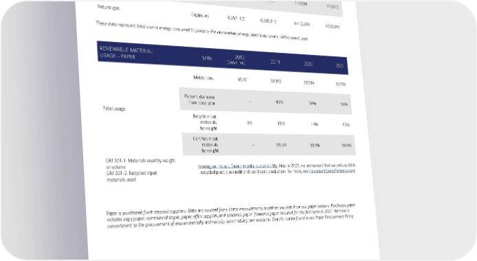 INDIRECT ENERGY CONSUMPTION BY PRIMARY FUEL SOURCE Units 2010 (baseline) 2019 2020 2021 Coal Gigajoules 13,024,897 4,192,337 3,448,427 2,830,605 Petroleum Gigajoules 791,057 184,799 114,594 112,612 Natural gas Gigajoules 8,357,102 6,395,315 6,412,249 6,530,861 These data represent total source energy consumed to produce the intermediate energy (electricity, steam, chilled water) used. RENEWABLE MATERIAL USAGE - PAPER Units 2010 (baseline) 2019 2020 2021 Total usage Metric tons 65,501 39,262 28,594 26,788 Percent decrease from base year - 40% 56% 59% Recycle input materials by weight 8% 15% 14% 15% Certified input materials by weight - 99.3% 99.3% 98.6% GRI 301-1: Materials used by weight or volume GRI 301-2: Recycled input materials used Making an impact, Environmental sustainability . Also: in 2022, we announced that we will use 80% recycled plastic in credit and debit card production. For more, see newsroom.bankofamerica.com . Paper is purchased from external suppliers. Data are sourced from direct measurements based on invoices from our paper vendors. Purchased paper includes copy paper, commercial paper, paper office supplies, and janitorial paper. Janitorial paper included for the first time in 2021. We have a commitment to the procurement of environmentally and socially sustainable paper products. Details can be found in our Paper Procurement Policy. 23