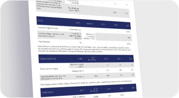 FACILITIES UNITS 2010 (baseline) 2019 2020 2021 26 LEED® (or comparable) certifications Net square feet 12,537,553 18,972,322 17,822,422 17,882,033 Percent of total square footage 10% 25% 24% 25% Land use and ecological sensitivity – U.S. GRI 304-1: Operational sites owned, leased, managed in, or adjacent to, protected areas and areas of high biodiversity value outside protected areas Sites that intersected with areas protected for biodiversity - - 9 10 Area of buildings (square meters) - - 6,900 7,120 FOOD UNITS (baseline) 2019 2020 2021 Cool Food Pledge Emissions Metric tons CO 2 e - - 4,403 Cool Food Pledge - reduction in total food-related emissions % reduction in total food-related emissions Not Available – this initiative launched in 2021 - - 44% Food Donations lbs - - - 26,401 Bank of America is part of the World Resources Institute (WRI) Cool Food Pledge, where companies pledge to provide delicious food that is better for the planet and commit to a collective target of reducing GHG emissions associated with the food they provide by 25% by 2030, relative to 2015. Emissions are calculated by WRI based on food types and amounts submitted by Bank of America. TRANSPORTATION UNITS 2010 (baseline) 2019 2020 2021 Electric vehicle charging Sites with charging stations - 57 57 56 Charging stations - 213 240 254 Support production and use of one billion gallons of SAF by 2030 # of gallons 1 billion N/A N/A N/A Total charging stations installed at Bank of America sites includes the cumulative number of global charging stations active in the reporting year. COMPLIANCE UNITS 2010 (baseline) 2019 2020 2021 Non-compliance with environmental regulations Value of monetary fines in $ USD 23,854 657 2,700 - Non-monetary violations 9 1 1 2 Reportable spills # of spills 2 0 3 1 Volume – US gallons 3 0 41 60