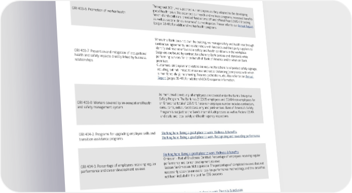 5 GRI 403-5: Worker training on occupational health and safety Annual safety related enterprise training is required of all employees and is compliant with applicable laws, rules and regulations. Additionally, safety and health training is provided for specific work environment hazards/risks in accordance with laws, rules and regulations (i.e., Chemical Inventory and Material Safety Data Sheets and Powered Industrial Truck Operator Training Assessment and Asset Inventory). See also the Bank of America Annual Report (pages 38-41, 120) for information on well-being-related trainings and other expanded resources. GRI 403-6: Promotion of worker health Throughout 2021, we supported our employees as they adapted to the developing global health crisis. We expanded our health and wellness programs, increased benefits for child and adult care, provided flexible time off and offered free COVID-19 testing as well as vaccine clinics in some of our workspaces. Please refer to our Annual Report (pages 38-41) for additional worker health programs. GRI 403-7: Prevention and mitigation of occupational health and safety impacts directly linked by business relationships Where the Bank does not own the building, we manage safety and health risk through contractual agreements, and relationships with landlords and third party suppliers to identify and resolve unfavorable safety and health conditions in the workplace. Suppliers are bound by contract to adhere to Bank policies and standards while performing services for or on behalf of Bank of America and/or when on Bank premises. Customers, employees and visitors are required to adhere to all posted safety signage, including, but not limited to mask use and social distancing (compliance with which is monitored daily), no smoking, firearms prohibitions, etc. Also refer to our Annual Report (pages 38-41) for additional COVID response information. GRI 403-8: Workers covered by an occupational health and safety management system As mentioned previously, all employees are covered under the Bank’s Enterprise Safety Program. The Bank has 212,505 employees and 53,414 non-employees for an Enterprise total of 265,919. Note non-employee number includes contractors, consultants, outsourced/access only and joint venture. Bank of America’s Safety Program is subject to the Bank’s internal Audit process as well as Federal OSHA and state and local safety and health agency inspections. GRI 404-2: Programs for upgrading employee skills and transition assistance programs Working here, Being a great place to work, Wellness & benefits Working here, Being a great place to work, Recognizing and rewarding performance GRI 404-3: Percentage of employees receiving regular performance and career development reviews Working here, Being a great place to work, Wellness & benefits Omission - Part of Disclosure Omitted: Percentage of employees receiving regular performance and career development reviews Reason for Omission: Not applicable. The percentage of completed reviews does not necessarily speak to our overall pay-for-performance methodology, and this detail has not been included in the past for ESG purposes. GRI 405-1: Diversity of governance bodies and employees Working here, Being a great place to work, Diversity & inclusion GRI 405-2: Ratio of basic salary and remuneration of women to men 2022 Proxy Statement , 2021 Annual Report